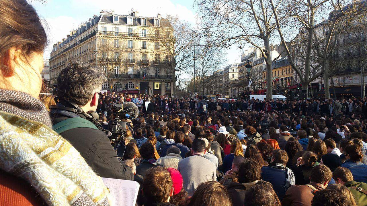 Sono arrivata in Place de la République verso le 6 di sera, martedì. Non sapevo bene cosa aspettarmi, perché dopo gli attentati la piazza è diventata più un mausoleo che un luogo di lotta e di festa, come invece era sempre stato. Il memoriale, in effetti, è sempre lì, ma tutto intorno alla statua della Repubblica listata a lutto ci sono capannelli di persone che discutono, sedute per terra. Ci sono gazebo e gente che suona qui e là ma, soprattutto, c’è tanta gente seduta davanti a qualcuno che sta parlando al microfono. A volte, la folla agita le mani in segno di approvazione o disaccordo e un oratore lascia il posto a un altro: un sans papier, una donna, un ragazzo… Ma perché così tante persone sono venute qui, stasera? Lo chiedo a Sébastien: