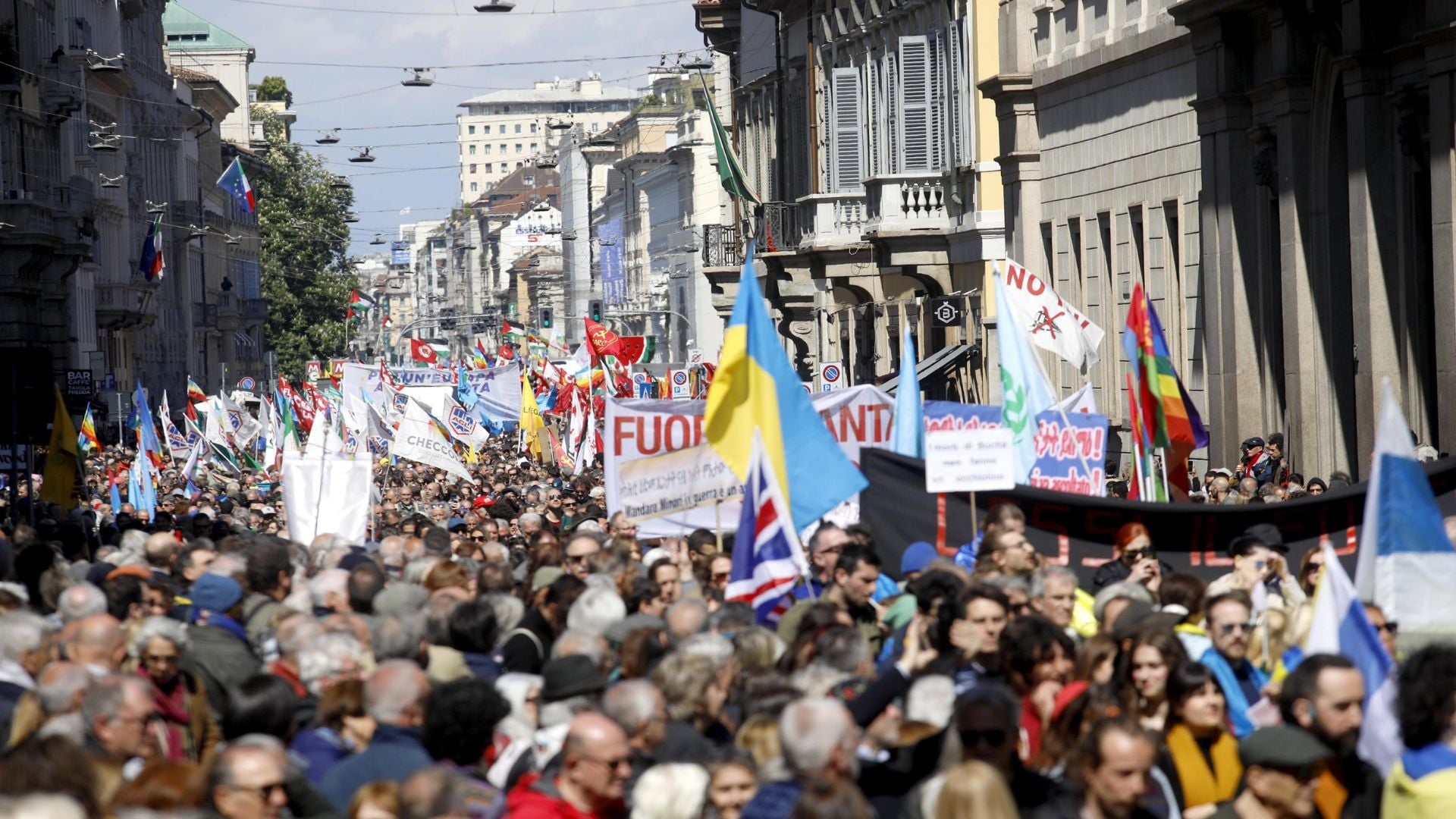 Più che una manifestazione, sono state due: due film, quello in piazza e quello fuori. In piazza le bandiere palestinesi in netta prevalenza, gli striscioni e gli slogan contro Israele, contro il Sindaco Sala, e gli spintoni tra ragazzini di seconda generazione ed esponenti della Brigata Ebraica. Fuori, indietro, centomila persone sotto le insegne dei partiti, dei sindacati, delle associazioni, che hanno sfilato serenamente, del tutto ignare e probabilmente disinteressate alle tensioni della vigilia.