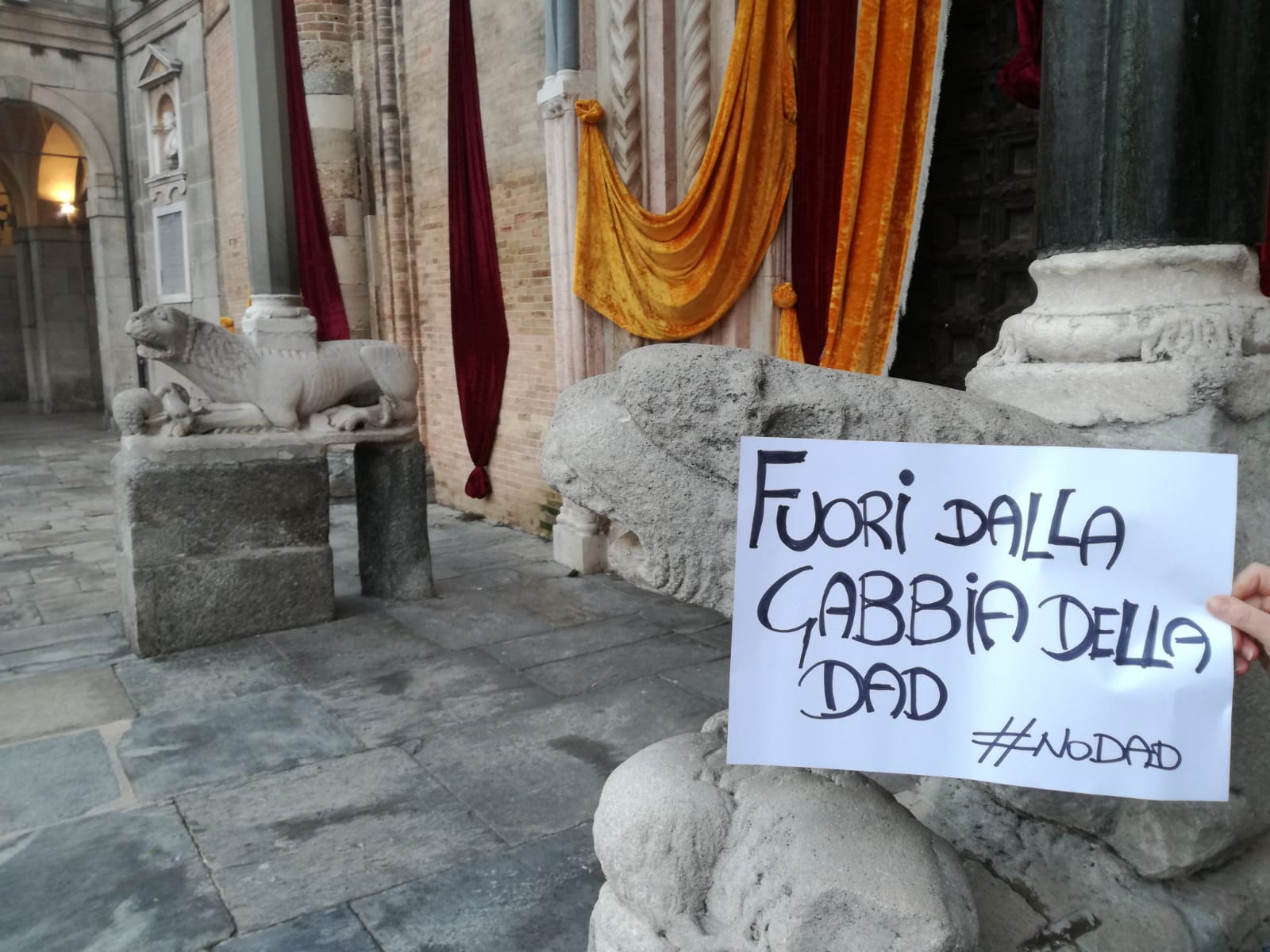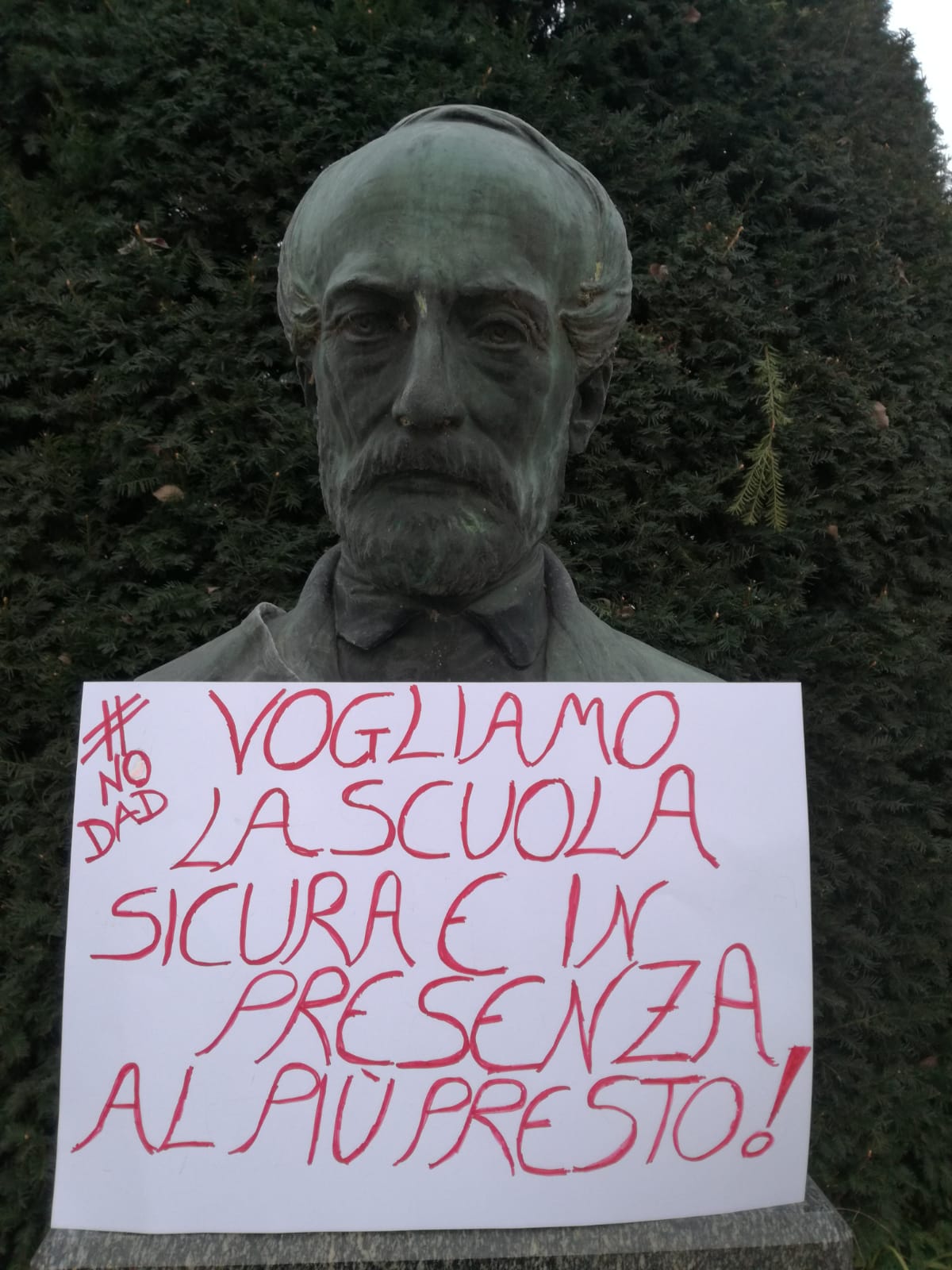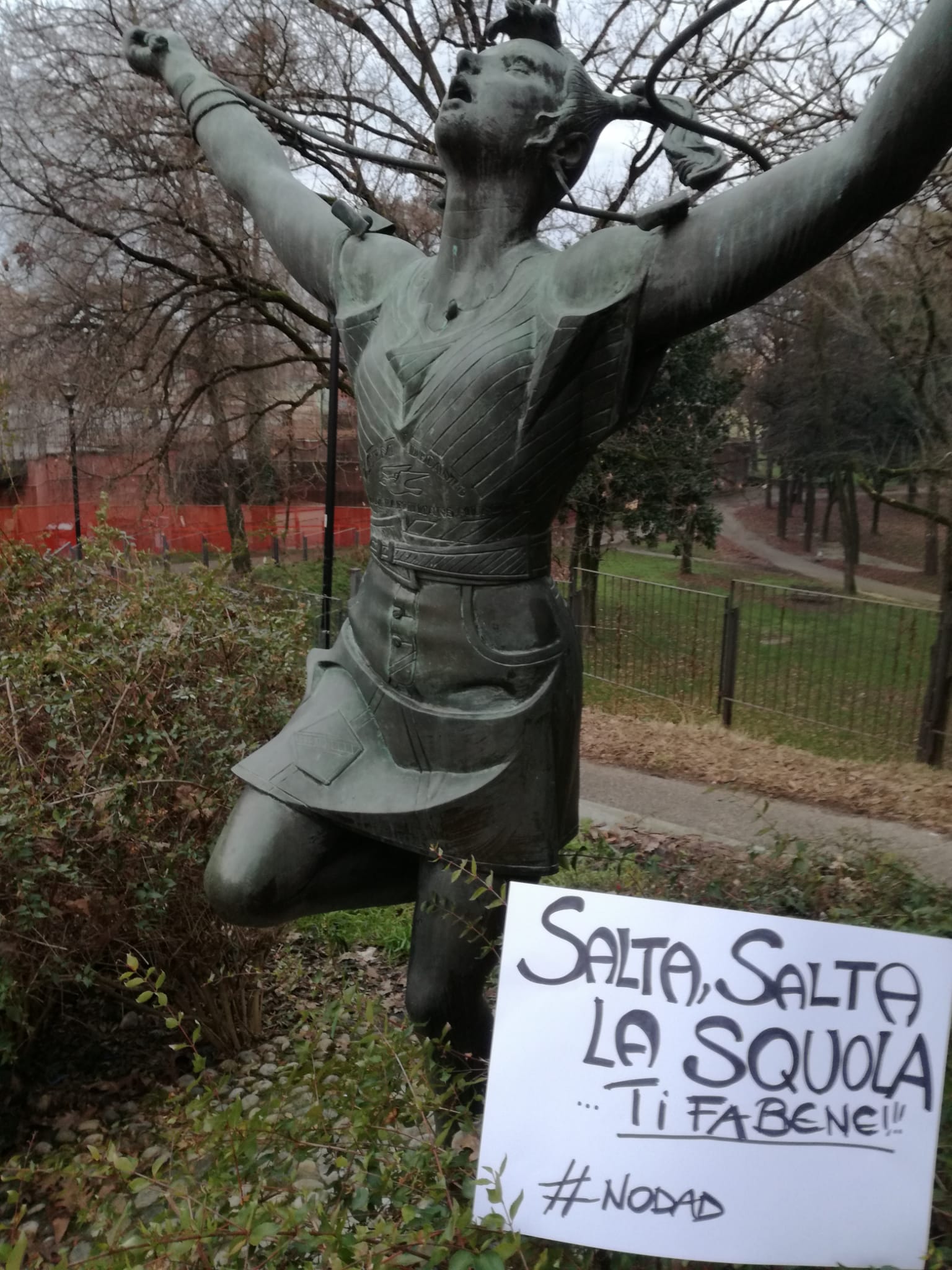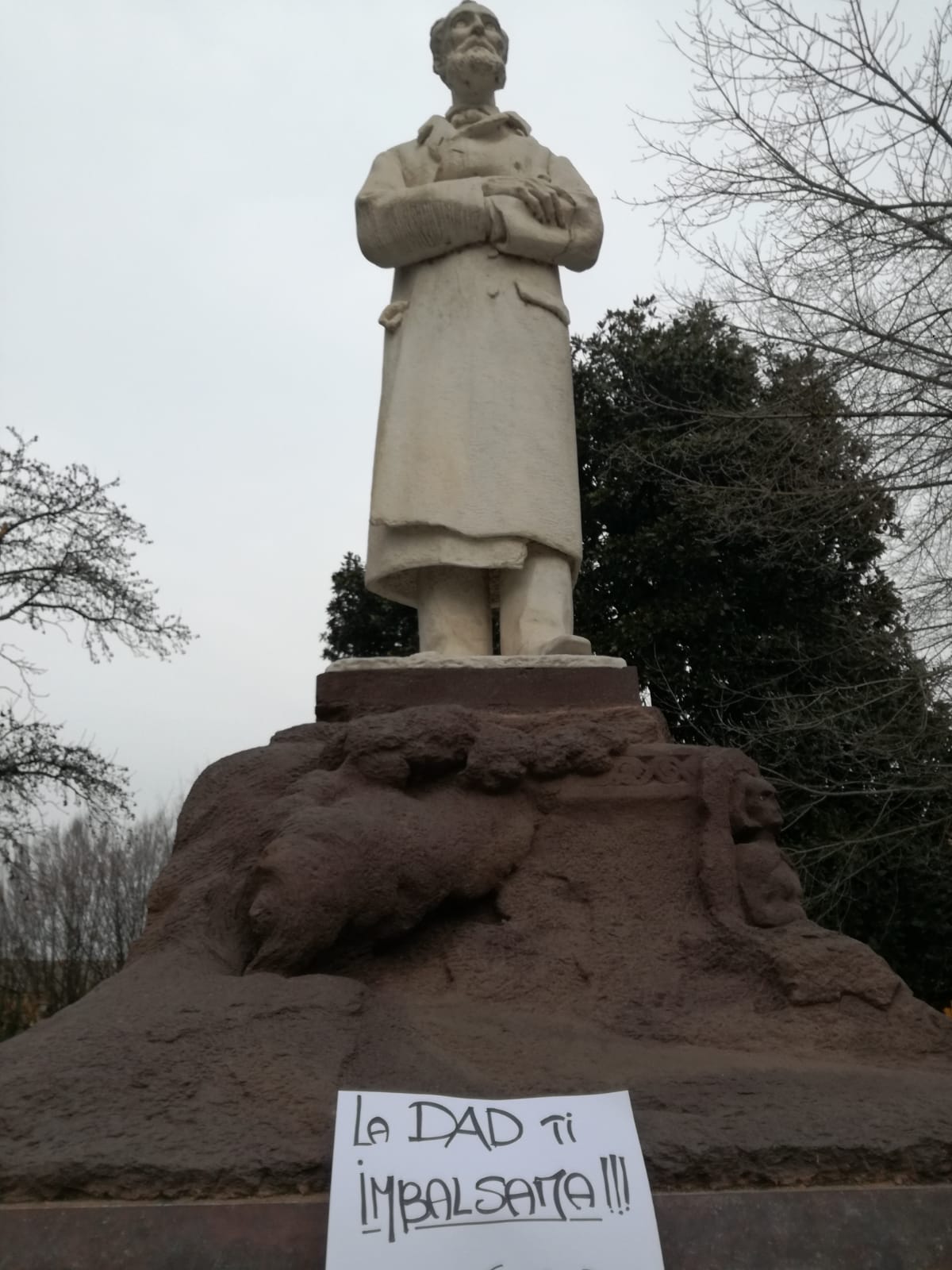 Ogni mattina una statua con un cartello e una foto, che rimbalza sui social e sulle chat di sempre più lodigiani. E nel frattempo hanno detto la loro le statue di Barbarossa, Mazzini, i leoni davanti al Duomo. E poi un Vittorio Emanuele anti-dad che esorta: “La scuola risorga”.