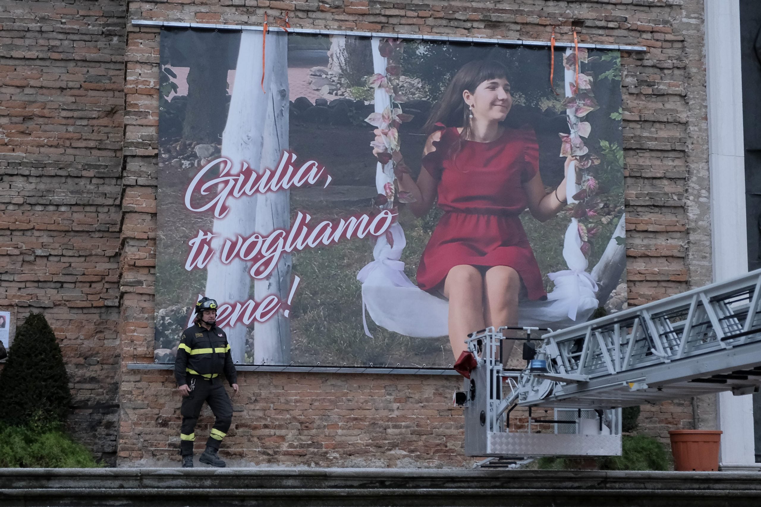 Foto | La gigantografia di Giulia Cecchettin, la 22enne uccisa dall’ex fidanzato Filippo Turetta, affissa fino ad oggi sulla parete del Municipio di Vigonovo, è stata trasferita a Padova per il funerale e collocata nello spazio antistante la basilica di Santa Giustina