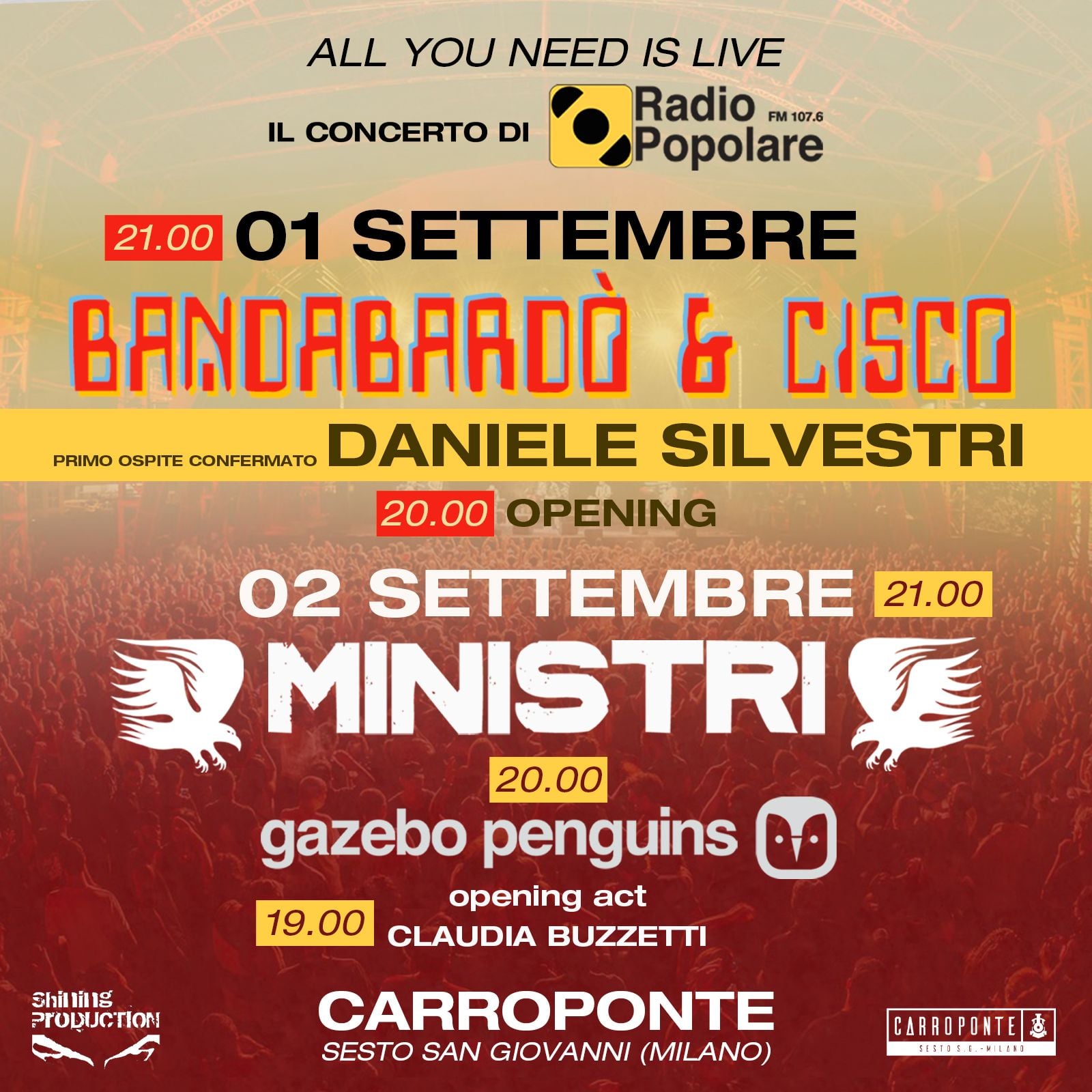 All You Need Is Live: con Radio Popolare al Carroponte 1 e 2 settembre. Bandabardò + Cisco (ospite Daniele Silvestri) e Ministri + Gazebo Penguins