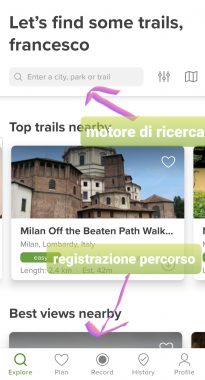 Tra le altre funzionalità interessanti di ALLTRAILS: il tasto “RECORD”, per registrare il proprio percorso (tempi e modalità di percorrenza), la possibilità di farsi guidare verso il sentiero scelto da un navigatore esterno, come Waze o Google Maps, e la possibilità di avere segnalazioni mirate anche per chi fa Running, Mountain Bike o per esempio Bird watching.