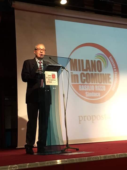 Uno spicchio rosso, con la scritta “sinistra e costituzione”, il nome “Milano in Comune”, con tre semicerchi colorati (arancione, verde e viola) e sotto, bianca in campo rosso, la scritta “Basilio Rizzo sindaco”. La lista civica Milano in Comune ha votato il simbolo che la accompagnerà alle elezioni comunali del prossimo giugno. E ha incoronato il suo candidato sindaco, Basilio Rizzo. Che ha aperto ufficialmente la sua campagna elettorale in un’affollatissima sala Di Vittorio della Camera del Lavoro con un discorso in cui ha mischiato sogno e pragmatismo amministrativo. Partecipazione e democrazia, difesa e ampliamento dei diritti, civili e sociali, sono alcuni dei temi forti che l’attuale presidente del consiglio comunale milanese intende mettere al centro del suo programma. “Abbiamo deciso di fare la cosa giusta – ha esordito Rizzo – ossia portare avanti quel sogno e quella speranza di cambiamento che cinque anni fa portarono Giuliano Pisapia al governo di Milano”. E che, nella figura del candidato sindaco del centrosinistra Giuseppe Sala, sono andati traditi. Si rivolge ai molti, dice Rizzo, che non vogliono essere governati da un sistema consociativo, rappresentato dai candidati manager, a cui vuole essere alternativo. Parla di partecipazione, di difesa della democrazia, di beni comuni, ma anche di scelte amministrative concrete, di periferie e difesa dei più deboli. Con la promessa, incarnata dalla sua storia più che trentennale a palazzo Marino, di rappresentare i valori di legalità, trasparenza e competenza amministrativa. E la serenità, dice, di chi presenta un progetto politico valido per una Milano migliore. “Perché noi – sorride – nella nostra carriera politica abbiamo visto sconfitte (tante) e vittorie (poche), ma ogni volta abbiamo saputo rialzarci, mantenendoci coerenti con la nostra storia. Di sinistra”