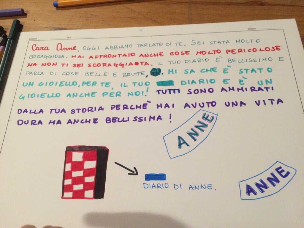 Gli incontri si concludono spesso con una pagina scritta dai bambini, è il diario che loro indirizzano ad Anna. A lei si rivolgono chiamandola “cara Anne” e la ringraziano usando il linguaggio di bambini delle elementari: “E’ stata una fortuna che il tuo diario si sia salvato, altrimenti vivremmo in un mondo di razzisti”, così scrive un bambino durante un laboratorio che si è tenuto alla Casetta rossa a Roma, un’altra bimba invece la ringrazia per il suo esempio di forza: “Hai avuto una vita bella e brutta e il diario è stato un gioiello per te ed è un gioiello anche per noi”.