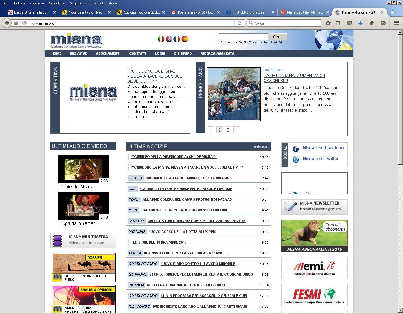 Il 31 dicembre 2015 chiuderà Misna, l’agenzia di stampa dei missionari ( Consolata, Comboniani, Saveriani e PIME). Un fulmine a ciel sereno che chiude una storia cominciata nel 1997. Misna è sempre stata la voce degli ultimi, uno spazio per notizie che altrimenti non avrebbero avuto spazio nei media italiani. Questo è il comunicato sindacale e in fondo Alessia De Luca, giornalista del Cdr, racconta la situazione in azienda