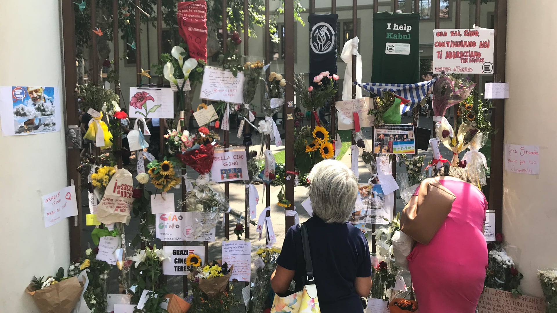 Un flusso continuo di persone per tutto il fine settimana tra le transenne che costeggiano la sede di Emergency, in Via Santa Croce, o in cerca d’ombra sotto gli alberi attorno alla chiesa di Sant’Eustorgio. Oltre duemila in questa domenica mattina di caldo d’agosto, ordinati, autoregolati, con i volti commossi e sorridenti accompagnati da un’organizzazione imponente della ong. La serpentina si fa silenzio già dall’entrata nel guardino della sede fino al momento del saluto all’ultima foto di Gino sorridente su una spiaggia in Normandia e alle sue ceneri. Attorno i gonfaloni listati a lutto delle sue due città natie, Sesto San Giovanni e Milano, la maglia della vecchia Inter su una poltrona, la musica dei Pink Floyd in sottofondo.