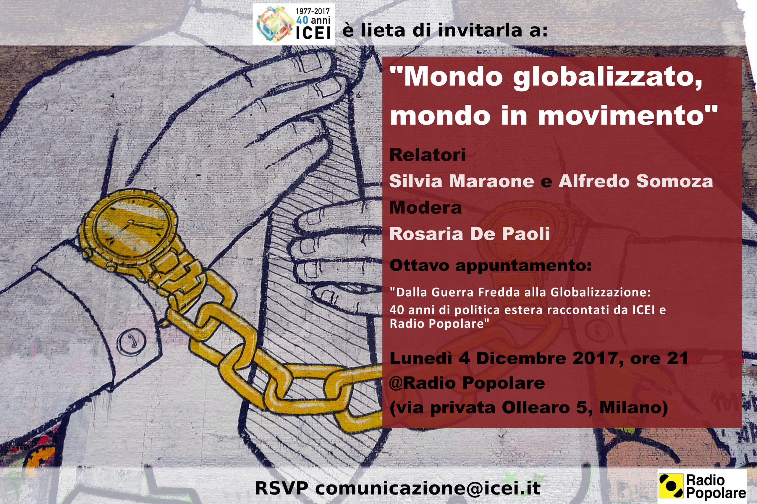 Ultimo incontro del ciclo “Dalla Guerra Fredda alla Globalizzazione: 40 anni di politica estera raccontati da Icei e Radio Popolare”. Lunedì 4 dicembre alle 21, nell’auditorium di via Ollearo 5, l’ottavo appuntamento: “Mondo globalizzato, mondo in movimento”. Intervengono i relatori Silvia Maraone e Alfredo Somoza, modera Rosaria De Paoli.