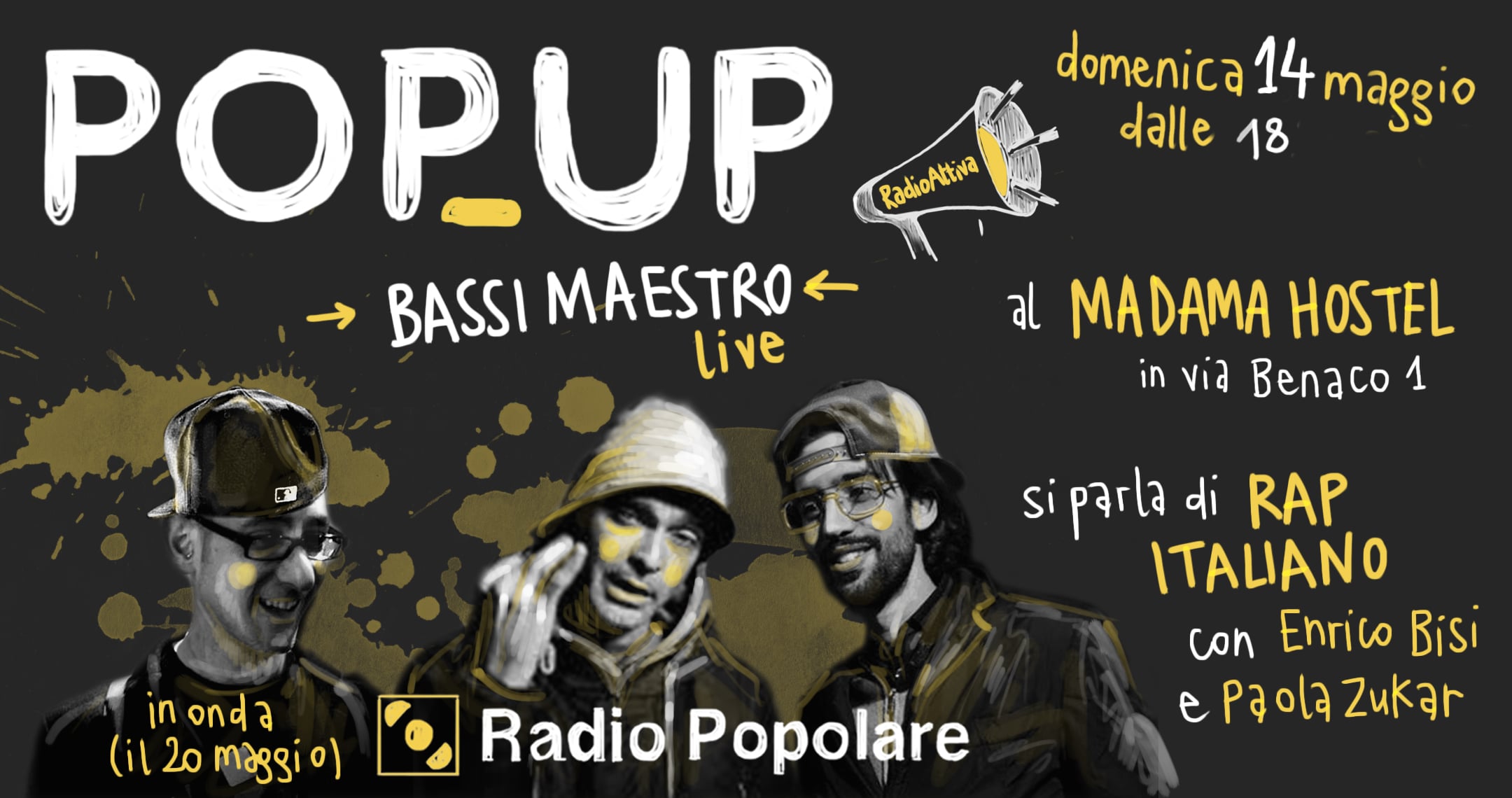 Domenica 14 maggio PopUp registra dalle 18.30 al Madama Hostel in via Benaco 1 e racconterà, partendo dalle radici, la storia del rap italiano con Paola Zukar, autrice del libro “Rap, una storia Italiana” ed Enrico Bisi, autore del documentario culto “Numero Zero, alle origini del rap italiano”.