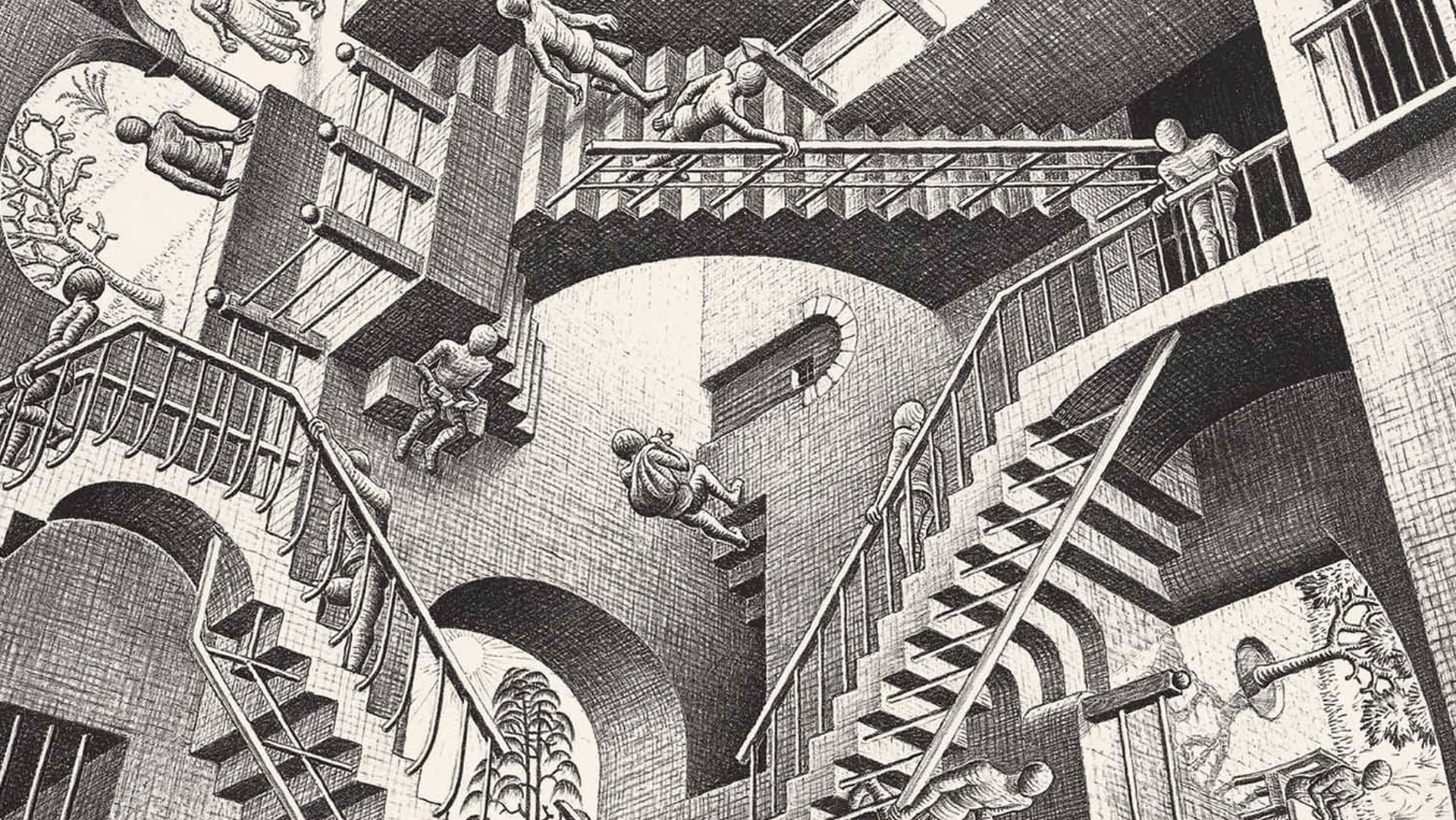 Lorenzo Coltellacci ha scritto un racconto biografico non lineare, interrotto da colpi di scena, fughe e inseguimenti tra geometrie variabili e scale infinite. E non ha dimenticato né il colpo di scena finale, né l’antagonista: un guardiano dei mondi impossibili che sembra simbolizzare il rischio, sempre in agguato per un artista, di scivolare dal genio alla follia o di perdersi tra i paradossi e le illusioni, ottiche in questo caso, facendo crollare le fantasie come fragili castelli di carta. Anche se, come diceva Escher: nelle mie opere ciascuno ci vede ciò che vuole.