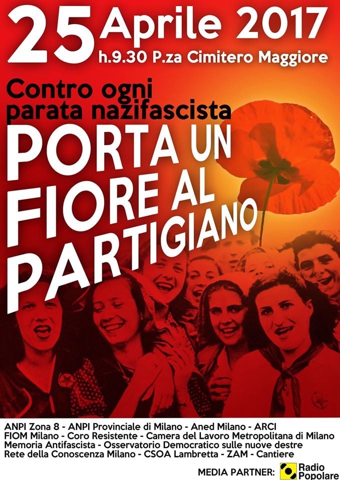 Centinaia di persone hanno partecipato all’iniziativa “Porta un fiore al partigiano“, organizzata da Anpi, Cgil, Fiom, alcuni centri sociali e altre realtà dell’antifascismo milanese al cimiter0 Maggiore di Milano. Una risposta importante alle provocazioni fasciste, che anche quest’anno dovevano andare in scena al Campo X dello stesso cimitero, dove sono sepolti i morti della Repubblica Sociale Italiana. La parata è stata vietata, ma l’omaggio ai Partigiani si è fatto lo stesso, con i fiori, le bandiere rosse, i canti della Resistenza.