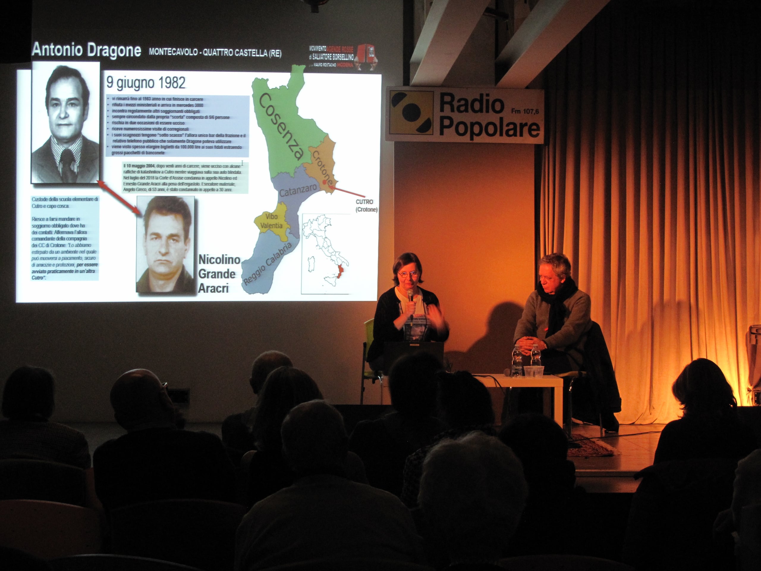 Ospite Sabrina Natali, attivista nel movimento delle Agende Rosse; impiegata grafica a Sassuolo. Sabrina Natali è autrice di un’importante opera di documentazione sul processo Aemilia, il processo che ha svelato la presenza della ‘ndrangheta in Emilia. Sabrina Natali ha trascritto il contenuto del dibattimento processuale e lo ha pubblicato sul sito processoaemilia. Insieme a lei sul palco dell’auditorium anche il professor Nando dalla Chiesa, presidente della Scuola di formazione “Antonino Caponnetto”.