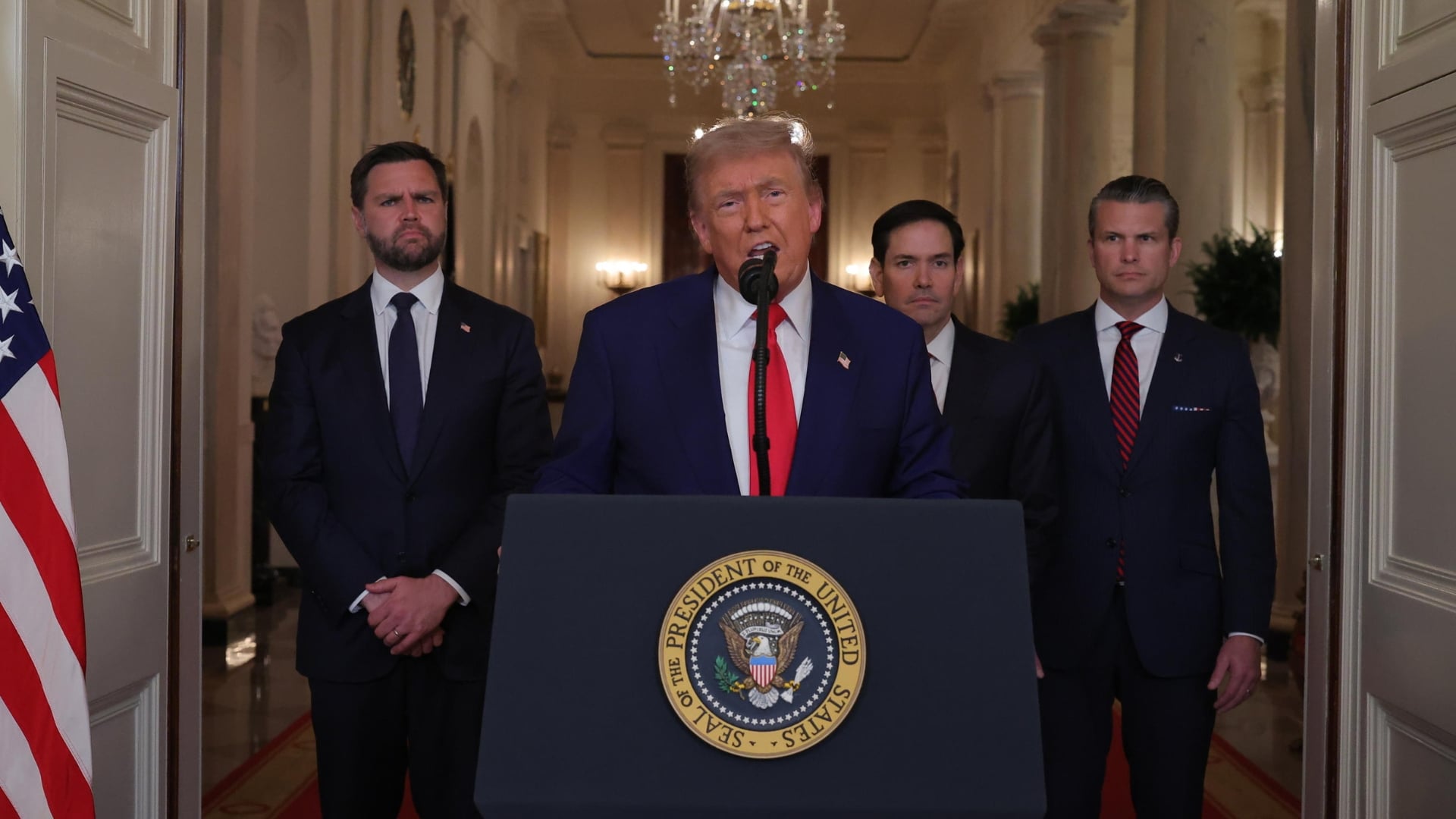 “Il bullo del Medio Oriente ora deve fare la pace”: lo ha detto Donald Trump parlando dalla Casa Bianca. Dietro di lui il vicepresidente Vance, il segretario di stato Marco Rubio, il segretario alla difesa Hegseth.