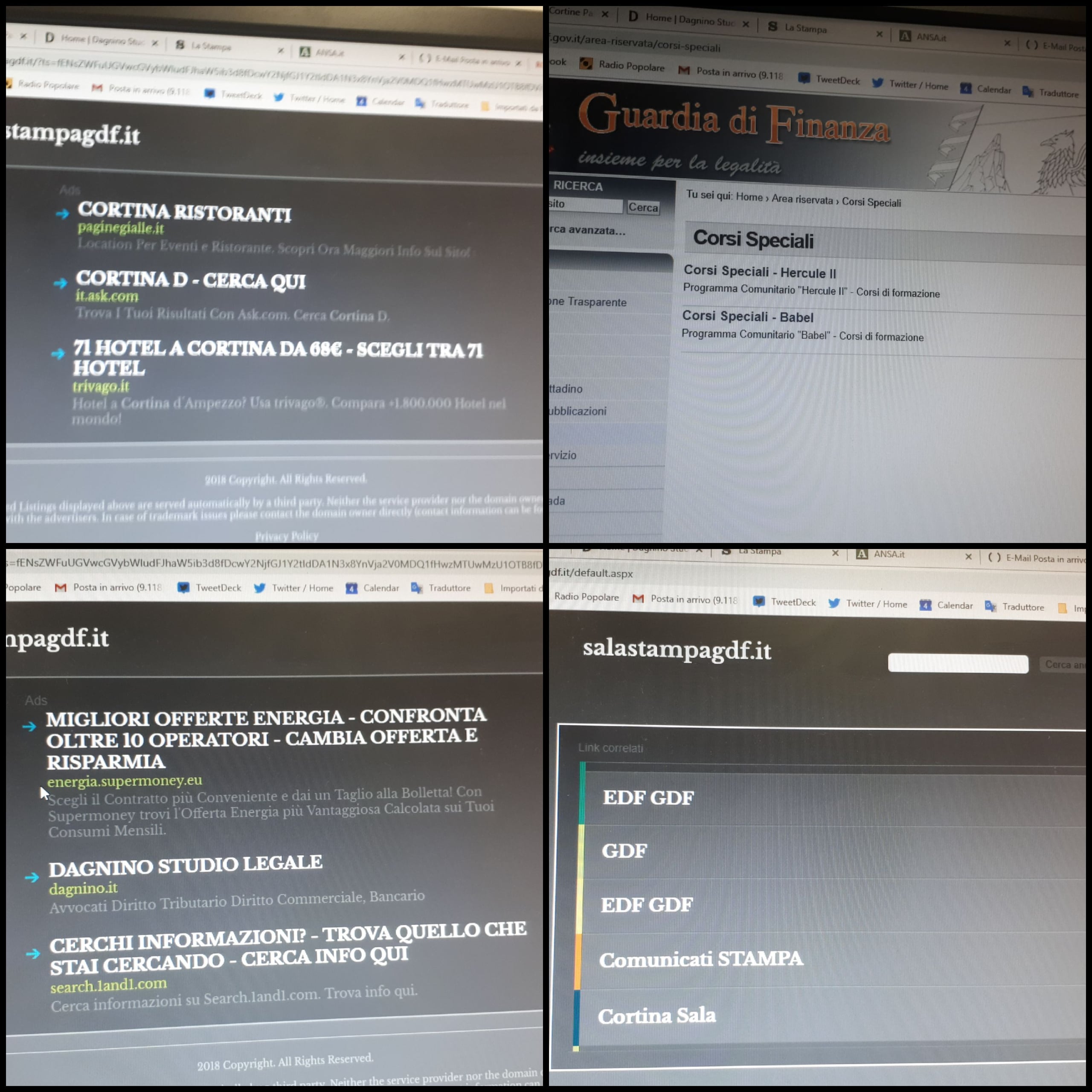 Alberghi, ristoranti, studi legali, società di comunicazione. La mattina del 21 settembre, dal sito ufficiale della Guardia di Finanza (www.gdf.gov.it) si arrivava a una pagina, apparentemente ufficiale anch’essa, che – al posto dei contati della sala stampa, mostrava dei link ad attività commerciali varie. Un virus? Un hackeraggio?