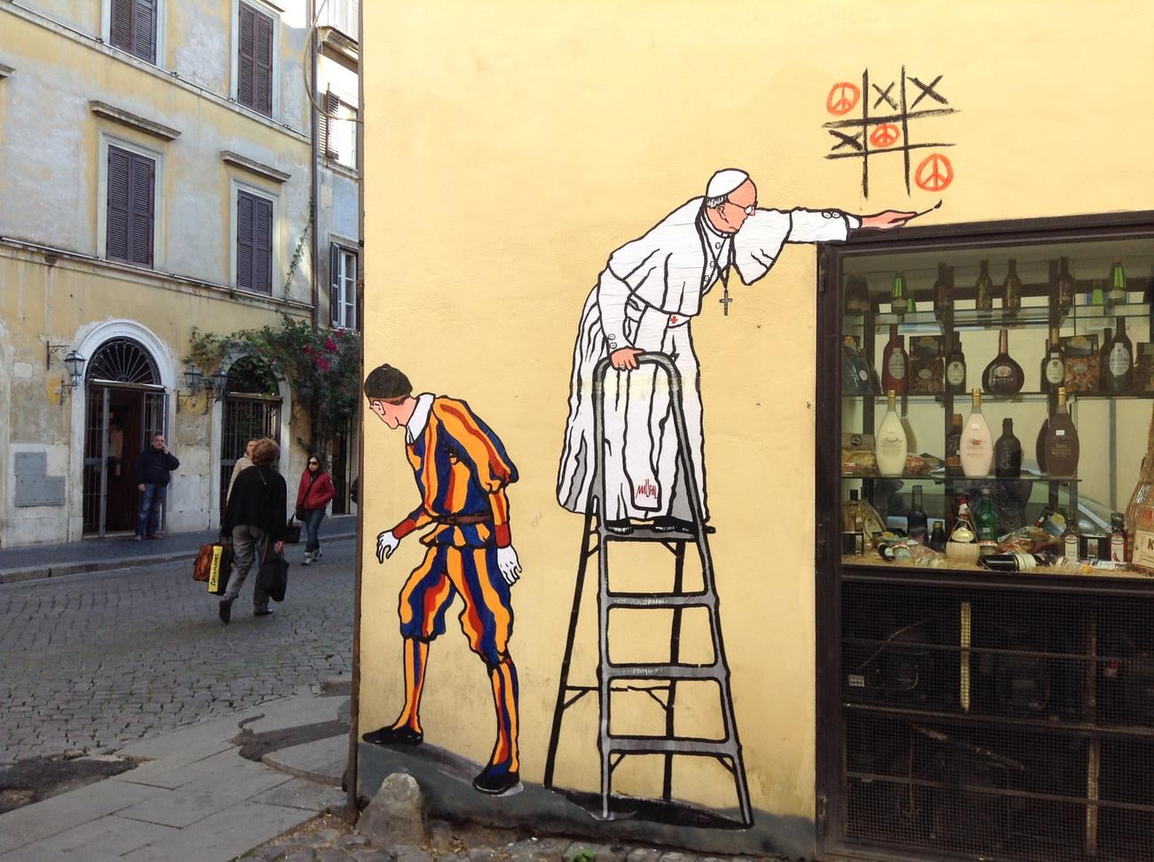 Veniamo al suo murale di Roma in cui il papa gioca a “tris” e vince usando al posto dei tradizionali pallini il simbolo della pace. Il tutto mentre una guardia svizzera gli fa da palo. E’ stato cancellato dal muro, scatenando molte polemiche. Lei cosa dice?