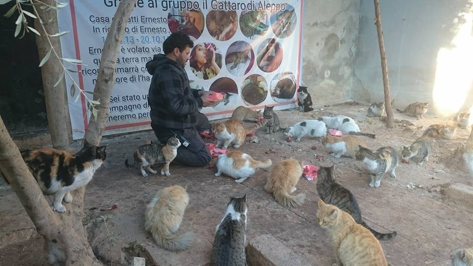 Così Alessandra si mette in comunicazione con lui, parla l’arabo; pensa a una piccola donazione e invece apre un gruppo chiuso su Facebook, “Il gattaro d’Aleppo”, per far conoscere la storia e aiutare lui e i gatti.