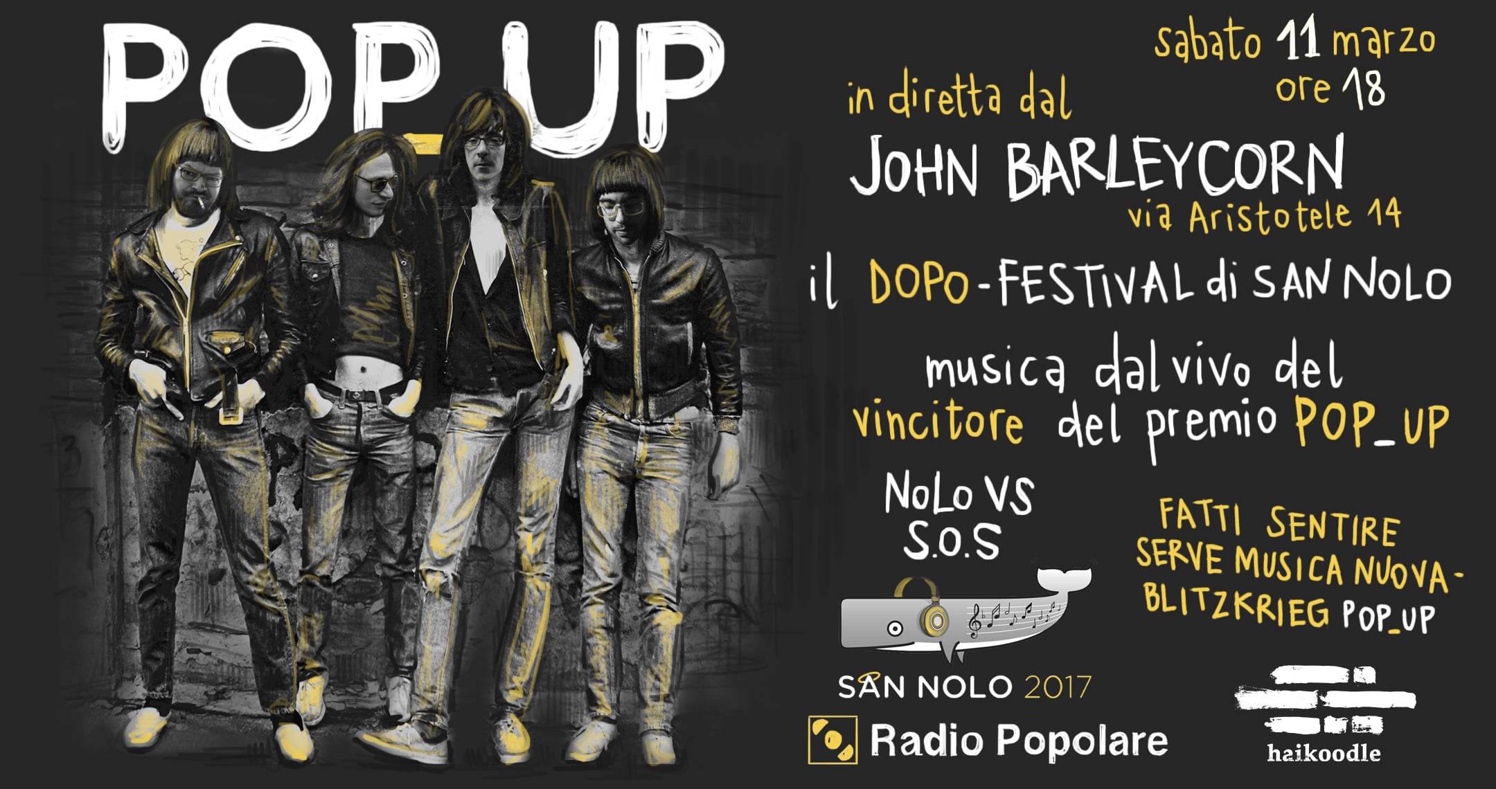 Sabato 11 marzo tornano in città le dirette di PopUp,il programma itinerante di Radio Popolare. Questa settimana il westfalia di Alberto Nigro & Andrea Frateff Gianni trasmette, in onda dalle 18.30, dal John Barleycorn, in via Aristotele 14, nuovo locale con annesso Orlando Music, lo studio di registrazione, nel cuore di Gorla a Milano, quartiere che giovani creativi sulla scia del successo di NoLo, acronimo di North of Loreto, hanno ribattezzato S.O.S, The South of Sesto.