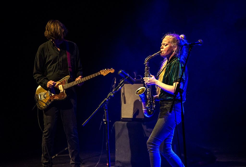 Thurston Moore tira fuori dalle corde un effetto che fa pensare ad una grattugia, o usa la chitarra, spesso senza toccare le corde, per dare vita a suoni prolungati e modularli; Mette Rasmussen col suo sax alto produce fischi e sovracuti: ha il senso di una performance estemporanea, ed è piuttosto brava a creare in tempo reale un legame con quello che fa il chitarrista dei Sonic Youth, che ha invitato a raggiungerla sul palco dopo una quarantina di minuti di solo. Il linguaggio di Mette Rasmussen (danese, trentottenne, ha fatto parte fra l’altro della Fire! Orchestra di Mats Gustafsson) è quello di un post-free radicale, che la sassofonista declina – rivelando una significativa personalità – in una chiave molto diretta e incisiva tanto nell’espressione che nel suono. Il suo set comincia con un brano di tredici minuti: poi brani più brevi, ognuno con una sua fisionomia, uno per esempio con barriti che scandiscono aspri fraseggi; infine un quarto d’ora di musica assolutamente informale in duo con Moore.