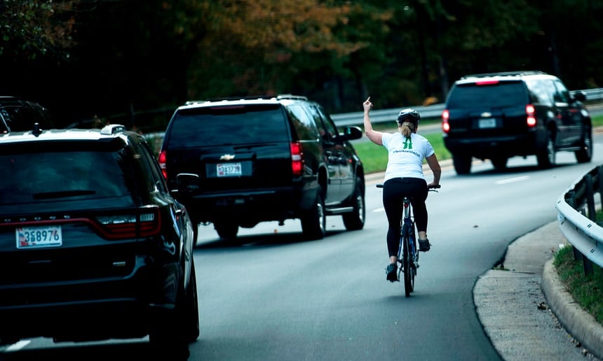 Tutto iniziò il 28 ottobre scorso. Juli stava pedalando lungo il suo consueto percorso nel nord della Virginia, quando il Suv nero di Donald Trump, seguito dalle auto di scorta, l’ha affiancata e sorpassata. Trump stava tornando da un campo da golf. Lei, senza pensarci più di tanto, ha alzato il braccio sinistro e ha mostrato il dito medio in direzione del corteo delle auto.