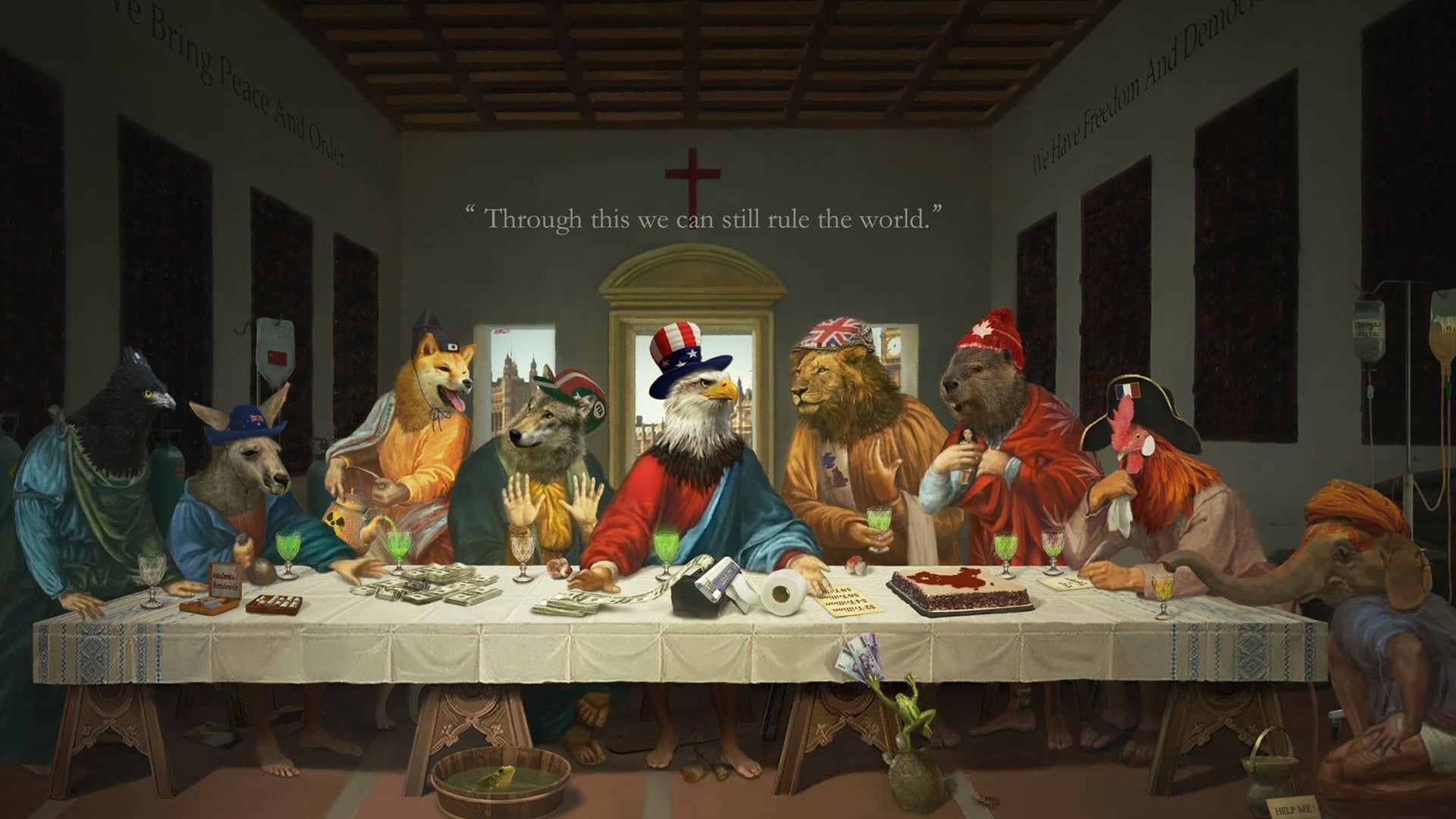 Dall’altro lato del tavolo, alla sinistra degli Stati Uniti, un leone-Regno Unito e una nutria-Canada, cercano le attenzioni dell’aquila reale, mentre un gallo-Francia, simile alla Germania, osserva. In ultimo, non seduto a tavola con gli altri, ma inginocchiato, un elefante che rappresenta l’India, viene disegnato come un malato, legato a delle sacche di flebo.