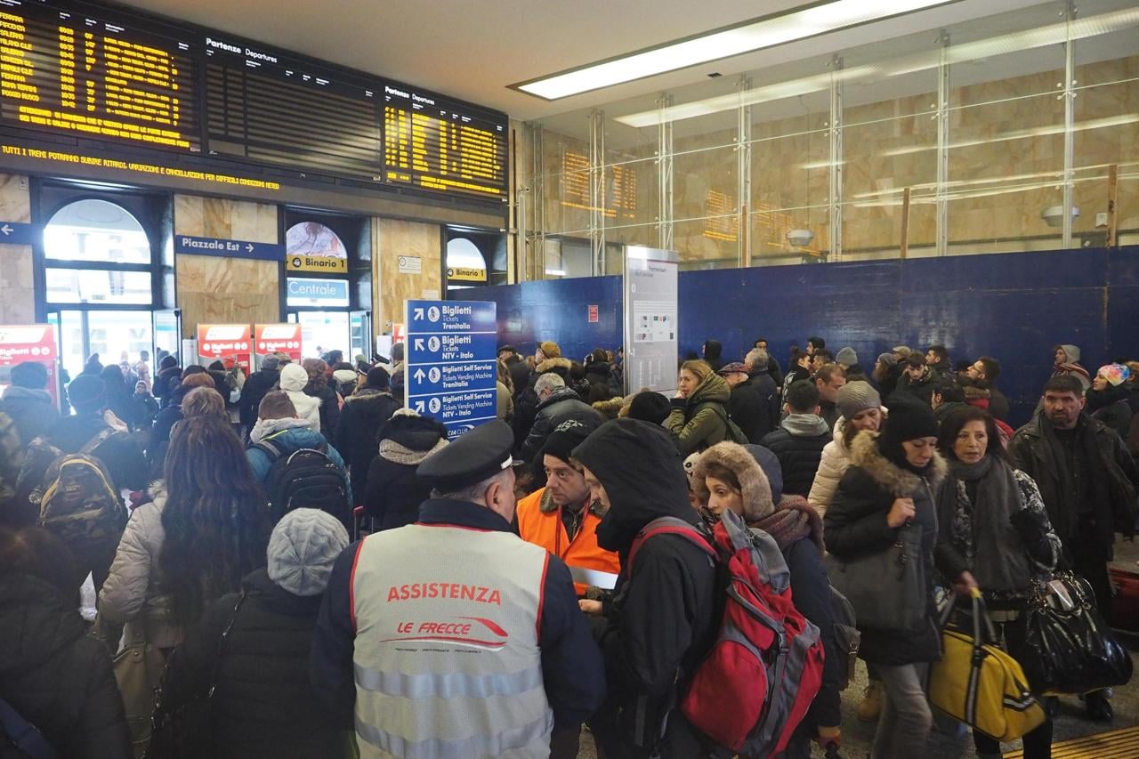 In fine mattinata del 26 dobbiamo andare da Milano a Bologna, cosa vuoi che sia, più o meno con l’alta velocità come un viaggio in metropolitana, un’ora e poco più. Sì ma la radio dice che causa neve la stazione Termini a Roma è bloccata. Facendomi forte della mia cultura scientifica tranquillizzo la persona con cui parto: vabbè ma non può provocare sconquasso fino a Milano, sarebbe come se un guasto nelle rete elettrica a Roma producesse un black out a Milano…. alla fin fine sono due reti elettrica e ferroviaria, certo diverse ma la dinamica delle reti è governata da leggi universali ben note…. dico un po’ gradasso e un po’ all’ingrosso. Comunque decidiamo di arrivare in stazione con largo anticipo che non si sa mai. E subito, al primo tabellone, il nostro treno compare con accanto “canc”, come!! non è possibile!? mettendoci in cerca di qualche addetto, il quale ci spiega mostrandoci l’intera situazione come compare sui monitor, con ritardi di 60, 200, addirittura fino a 310 minuti, che possiamo chiedere il rimborso del biglietto se decidiamo di non partire, e a scanso di equivoci più avanti c’è qualcun altro che dovrebbe saperne di più “perché qui le cose cambiano di minuto in minuto”, ovvero mi dico mentalmente c’è il caos, non so sulla rete ma certamente tra gli esseri umani addetti. Laddove potremmo chiedere il rimborso la fila è biblica, del tutto impraticabile, decidiamo di salire ai binari e – miracolo o disguido – il nostro treno ricompare almeno sul pannello con soli (sic) venti minuti di ritardo. Sembra fatta, ma nel giro di poco il ritardo cresce a 100, quindi 140, infine 200 minuti !!! Dopo un consulto tra noi, decidiamo di aspettare con pazienza in attesa di un treno che parta, non un regionale che quelli sono proprio scomparsi. Sì aspettare, ma dove? In stazione non c’è sala d’aspetto, vuoi mai che ci entri a riposare un barbone, un povero, un migrante, poi lo spazio serve per i negozi, il mercato ovunque è la parola d’ordine. Inoltre i bar sono pieni, affollati alcuni fino all’inverosimile. E sui marciapiedi fa un freddo cane. Per fortuna la persona che sta con me è titolare di una magica carta oro che consente l’accesso al Freccia Club, luogo di accoglienza caldo, dove puoi prendere il caffè, sgranocchiare biscotti, leggere i giornali seduto in comode poltroncine, fare una comoda pipì in bagni degni di questo nome, e ci sono pure tavoli dove puoi poggiare il computer. E un gruppo di manager, o almeno tali sembrano in rigorosi vestiti blu con cravatta regimental, tutti impettiti improvvisano una riunione. Ti aspetteresti che in una emergenza come questa il luogo fosse aperto – non dico a tutti, suvvia non bisogna esagerare con l’eguaglianza – ma almeno ad anziani, mamme coi bimbi, persone con evidenti disagi – invece no. Due accigliate signorine, molto comprese della loro funzione, fanno filtro e o hai la magica tessera o stai fuori al gelo. Poi dopo un’ora che stiamo lì arriva da parte di una delle suddette signorine l’avviso che tra venti minuti partirà dal binario ecc.. il treno freccia rossa numero tal dei tali per Taranto, e via tutti a precipitarsi. Solo che il treno lo hanno avvistato in molti, anche tra gli esclusi dalla sala riservata alle carte oro, e quindi c’è un poco (sic) di folla. Tutti attorno al capotreno che ha da sentirsi un poco assediato, e telefona in alto loco per sapere cosa deve fare: accogliere o no tutti questi clandestini in possesso di biglietti che nulla hanno a che fare col dovuto titolo di viaggio? Dopo alcune concitate esclamazioni, e telefonate che vanno e vengono, l’uomo si rivolge agli astanti dicendo che i suoi superiori gli hanno comunicato di non potere dare alcuna direttiva, insomma deve arrangiarsi, la decisione sta a lui. Il caos è arrivato ai vertici di trenitalia, che in confusione non sanno che pesci pigliare. Ma, miracolo, il capotreno dice: tutti a bordo che tra dieci minuti si parte, sedetevi dove trovate posto, se qualcuno che ha prenotato arriva, per favore alzatevi. E qui avviene un secondo miracolo: gli animi si distendono, saliamo mettendoci in fila ordinata, tutto tra un “mi scusi” un “grazie” un “per favore”, addirittura una signora al cui fianco ho trovato provvisorio posto fa cenno di alzarsi per cedere il suo sedile alla persona che sta con me: “ma voi siete insieme, si sieda” dice alla mia compagna, al che rifiutiamo. In piedi siamo tanti ma regna una sorta di serenità quasi conviviale. Insomma il gesto giusto e responsabile del capotreno ha svelenito l’atmosfera tra gli stessi utenti fino a poco prima assai bellicosi pure l’un contro l’altro armati (la classica guerra tra poveri, tra chi ha penuria, in questo caso penuria di posti in treno). Con episodi gustosi come la signora addetta a rifocillarci la quale, oltre a distribuire patatine a go go, individuato un vip, gran giocatore di rugby tutto tatuato, si è fatta fotografare abbracciata a lui mettendo anch’essa in mostra i suoi tatuaggi, tra gli applausi dei passeggeri. E così verso le 17 siamo arrivati a casa in Bologna, dopo essere usciti da casa in Milano alle 12, o poco più. Cinque ore, e ce la siamo cavata a buon mercato. Infine riprendo il discorso sui sistemi, le reti complesse, per definirlo un po’ meglio. E’ noto che una buona rete deve essere flessibile e resiliente, per esempio tale che se uno dei suoi nodi presenta un guasto, automaticamente viene escluso dal circuito, che continua a funzionare seppure in regime ridotto. L’esclusione del nodo infetto, la sua messa in quarantena finché non è risanato, impedisce la propagazione del guasto a altri segmenti (link) e nodi della rete. Tutte le reti sono progettate con questa salvaguardia, come le autostrade con la corsia di emergenza, che deve essere sempre lasciata libera nel corso ordinario. Io non so nulla di reti ferroviarie nello specifico ma se il blocco della stazione Termini, e il