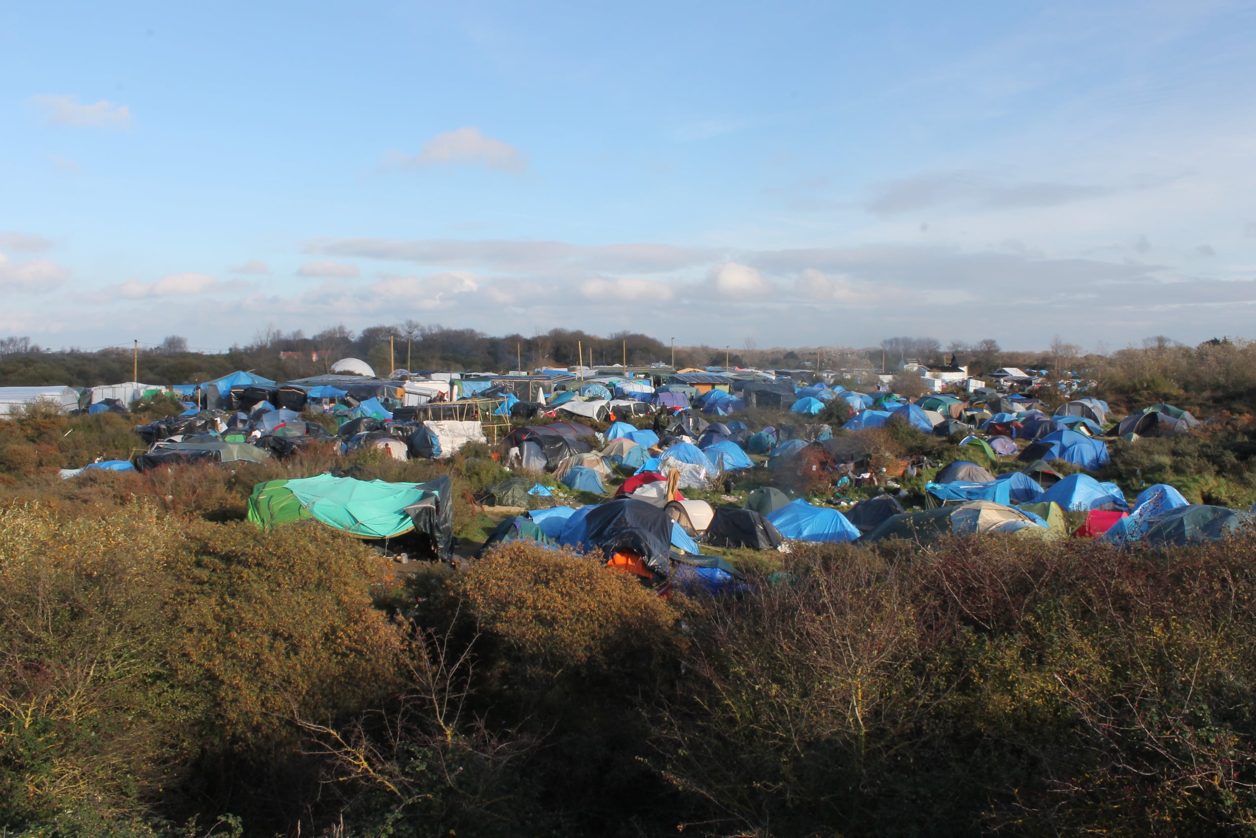 Quando sono arrivata vicino al campo, la prima cosa che ho sentito è stata l’odore dolciastro e persistente delle industrie chimiche che affacciano su una delle due strade da cui si accede alla Giungla. Poi ho visto le tende, sgangherate, ricoperte di plastica per proteggerle dalla pioggia e ammassate le une sulle altre per ripararsi in qualche modo dal vento del Nord.