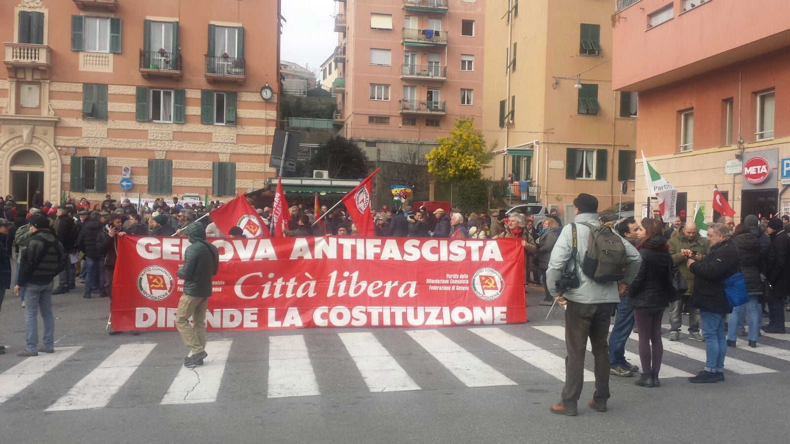 All’una sono partiti con un corteo, aperto dallo striscione Anpi ‘Genova non dimentica ora e sempre resistenza’ per raggiungere via Caprera insieme ai diversi antagonisti. In un quartiere, quello del levante cittadino, blindatissimo (400 agenti in strada e varie grate che a Genova ricordano quelle del G8), il segretario della Fiom ligure, Bruno Manganaro ha detto: “siamo qui per ribadire il nostro antifascismo, contro chi ha portato uomini e donne nelle camere a gas e ha torturato dirigenti sindacali e oppositori politici anche nella casa dello Studente a due passi da qui. Genova ha detto no a questo raduno, è un grande risultato – ha aggiunto Manganaro – e infatti questi sono costretti a radunarsi in un sottoscala”.