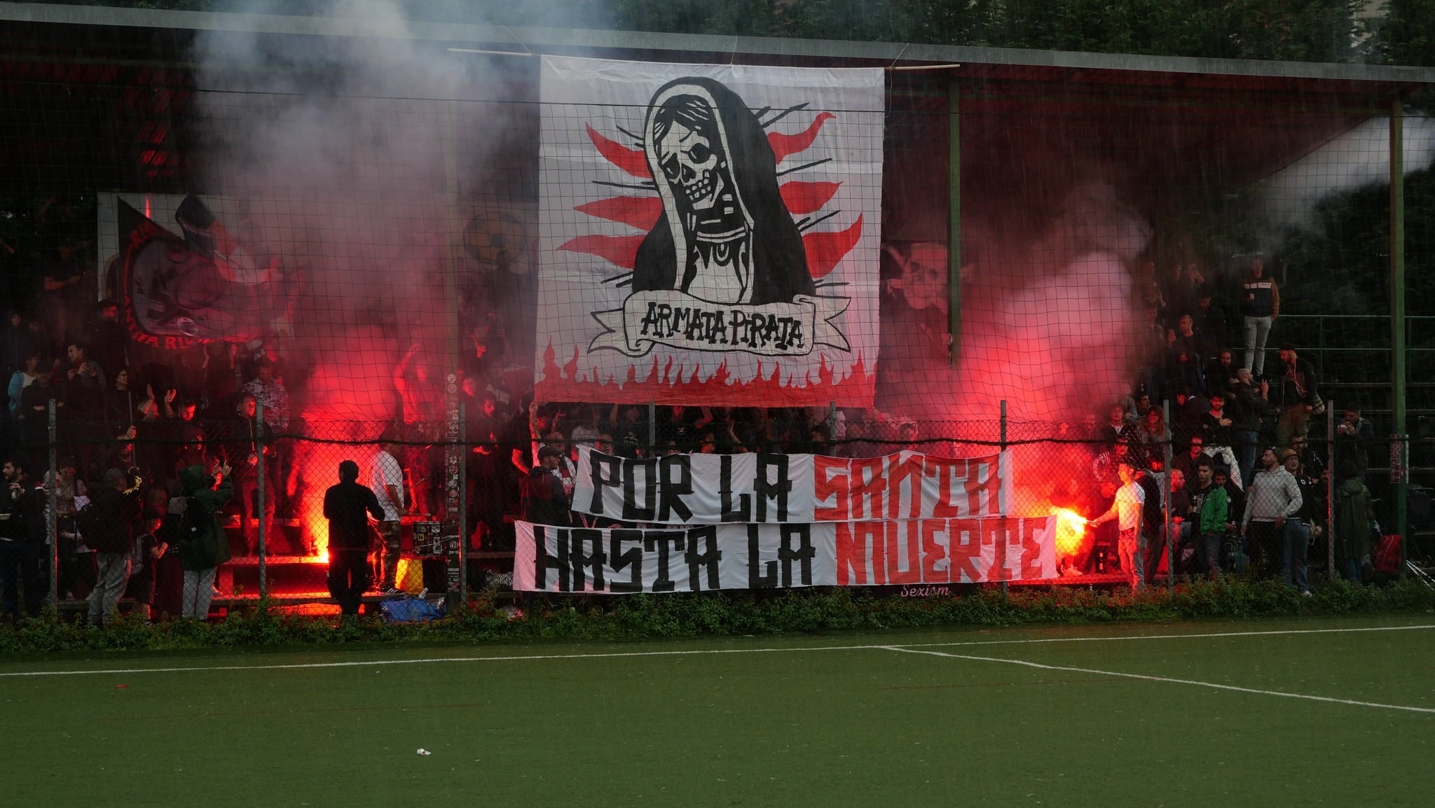 Invece il calcio popolare, il nostro calcio e la curva di una squadra di quartiere si differenzia dall’ambiente che si trova nei grandi stadi, da noi le regole e i valori sono dettati dagli stessi occupanti: la passione per la squadra si tramuta in un mezzo di militanza politica e nel caso specifico di Armata pirata per lottare contro il razzismo, l’omotransfobia e il sessismo. Il settore popolare è uno spazio di lotta e emancipazione. E quando ci tocca pagare il biglietto (succede in alcuni campi) la colletta non arriva a 3 euro.