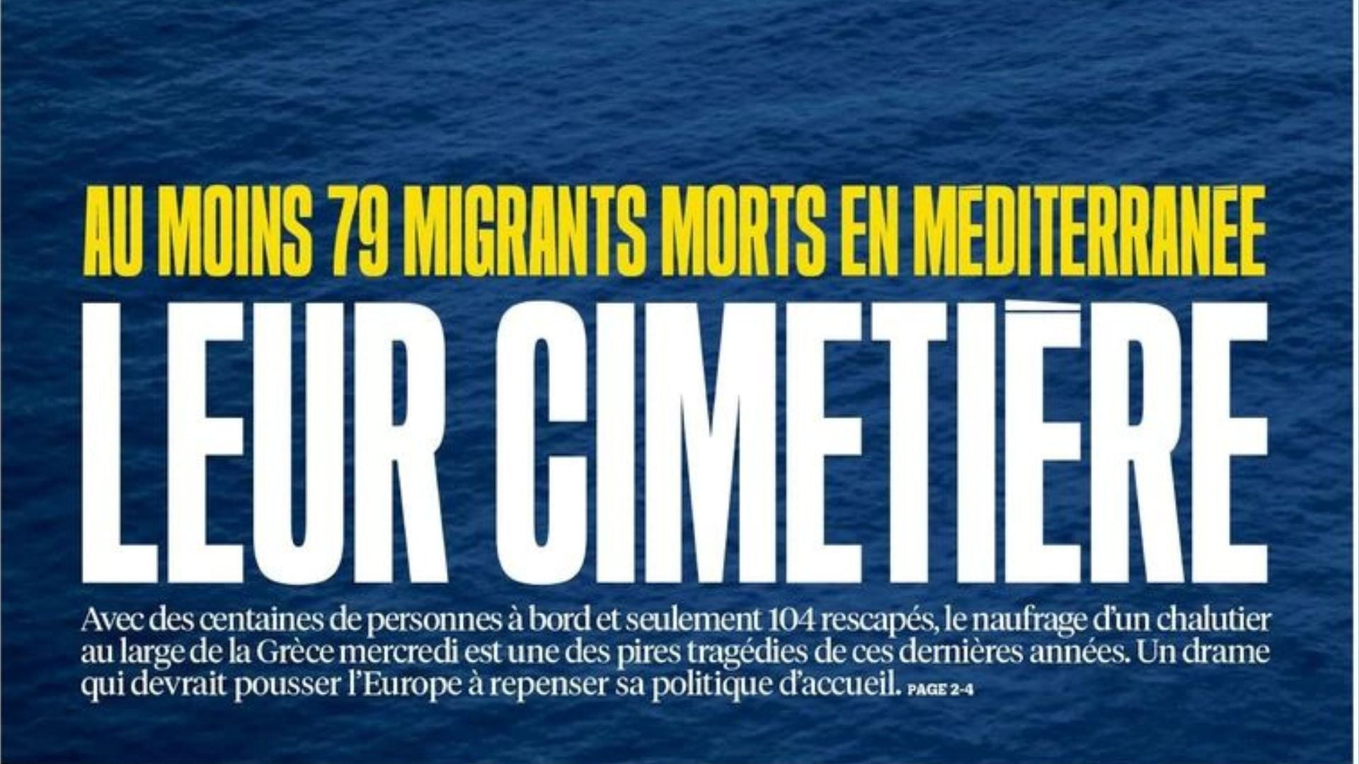 Una foto di mare blu.Niente cielo o orizzonte solo mare calmo di un blu profondo, quasi scuro, a tutta pagina. E sopra a questo mare muto profondo, di fatto già funebre, il titolo pure a tutta pagina: LEUR CIMETIÈRE… IL LORO CIMITERO… e più in piccolo il sottotitolo racconta : – almeno 79 migranti morti nel Mediterraneo. Con centinaia di persone a bordo e soltanto 104 sopravvissuti il naufragio di un peschereccio al largo della Grecia è una delle peggiori tragedie degli ultimi anni – …e il sottotitolo finisce … – un dramma che dovrebbe spingere l’Europa a ripensare la sua politica d’accoglienza.-