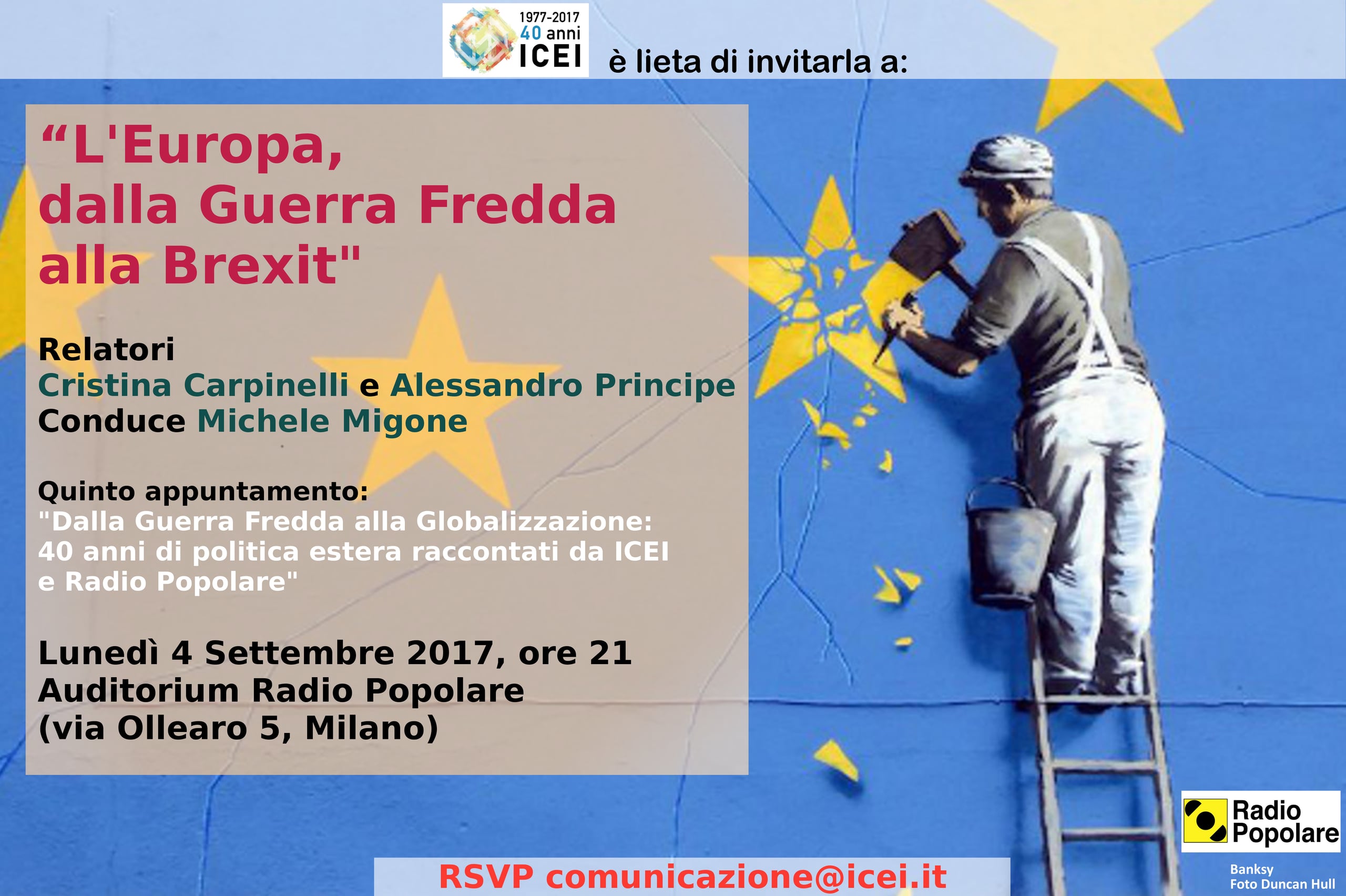 Prosegue il ciclo di incontri “Dalla Guerra Fredda alla Globalizzazione: 40 anni di politica estera raccontati da Icei e Radio Popolare”. Lunedì 4 settembre alle 21, nell’auditorium di via Ollearo 5, il quinto appuntamento dedicato al nostro continente: “L’Europa, dalla Guerra Fredda alla Brexit”. Intervengono i relatori Cristina Carpinelli e Alessandro Principe, conduce Michele Migone.