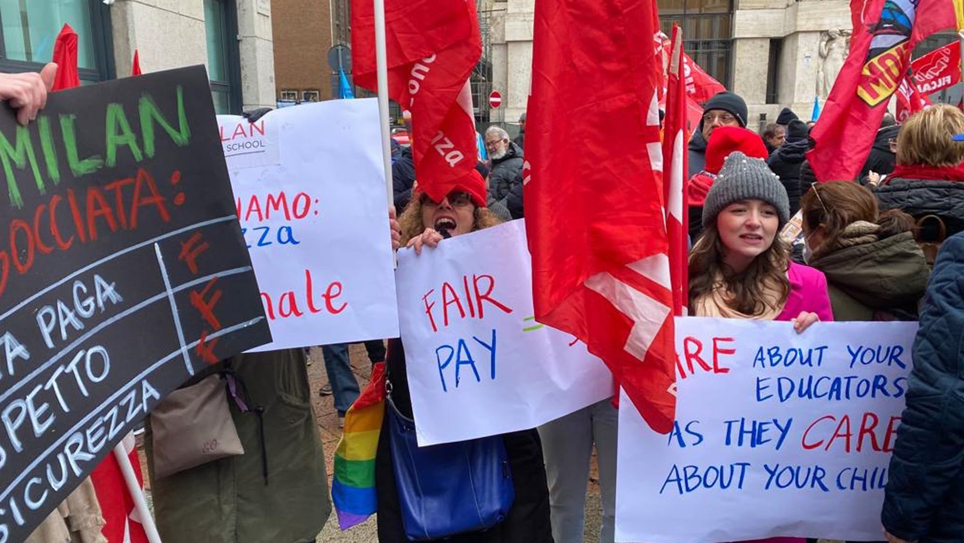 Il venerdì mattina sulla scalinata della Borsa si festeggiano le nuove quotazioni ma stamani Piazza Affari era piena di bandiere rosse e blu per il secondo sciopero generale della ormai duplice, visto che la Cisl, prima con Draghi e ora con Meloni rimane alla finestra.