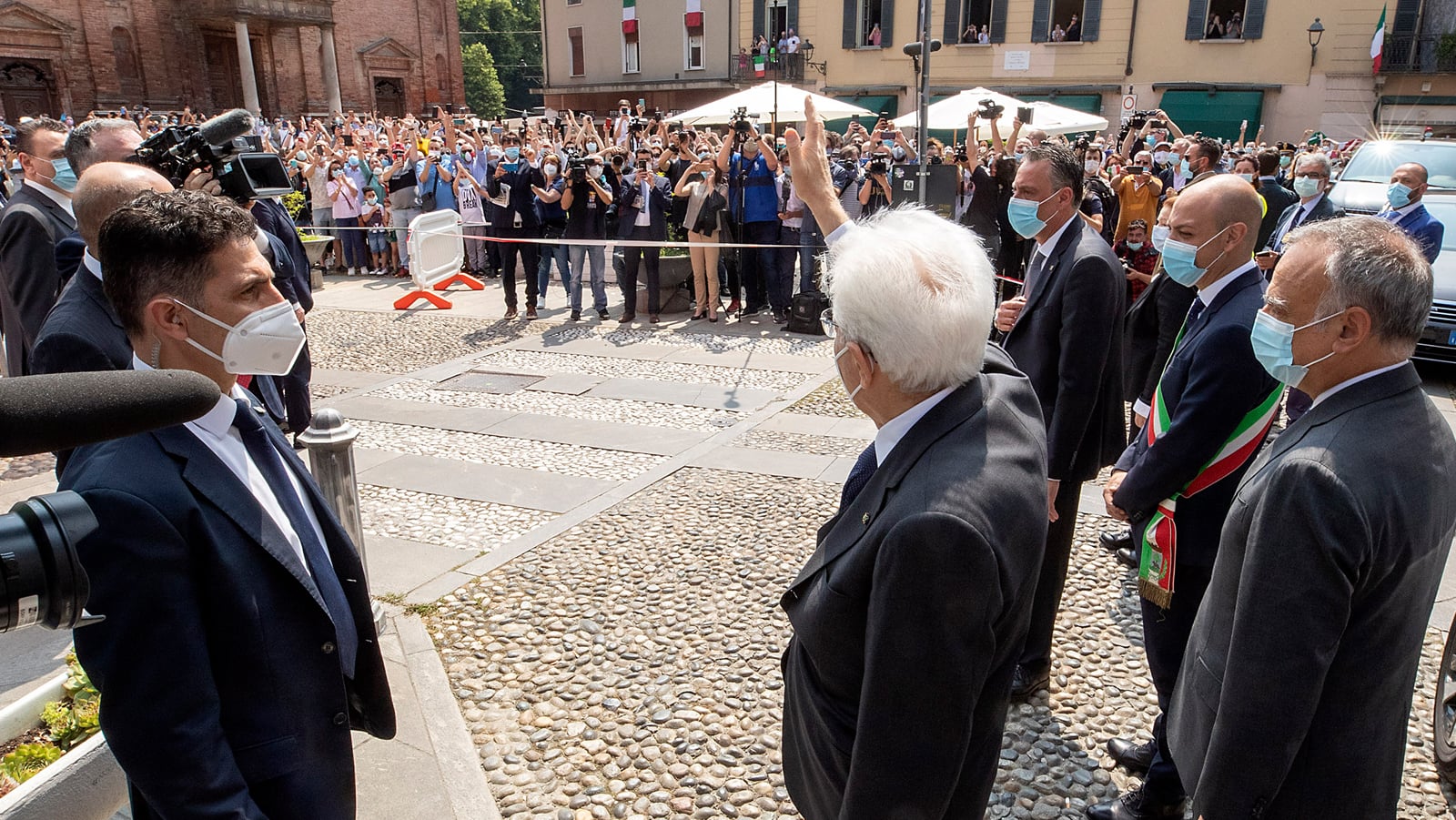 Nella Piazza centrale della cittadina capoluogo della bassa lodigiana, su cui si affaccia una chiesa di mattoni rossi, tutti i balconi sono addobbati con un tricolore, un bandiera di una ventina di metri copre un intero angolo di un palazzo proprio dove il presidente arriva con il corteo istituzionale. Ad attenderlo una folla di cittadini, non sempre distanziati, che applaude e filma con i telefonini.