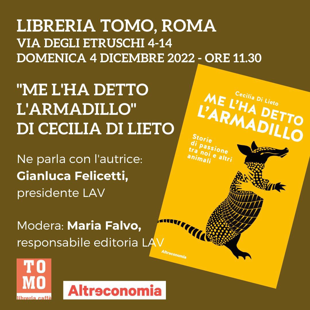 Domenica 4 dicembre 2022 alle ore 11.30 Cecilia Di Lieto presenta il libro “Me l’ha detto l’armadillo – Storie di passione tra noi e altri animali” alla libreria Tomo di via degli Etruschi 4-14 a Roma.