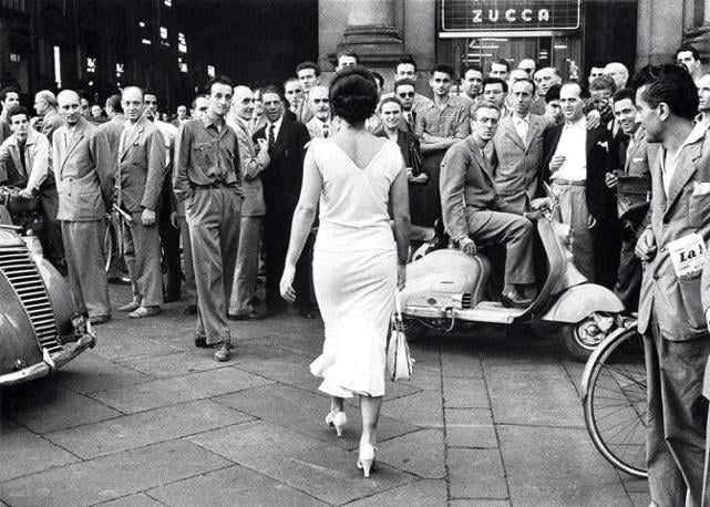 “Gli italiani si voltano“, una delle leggendarie immagini scattate dal grande fotoreporter Mario De Biasi, la ritrae di spalle, piena di curve e vestita di bianco, mentre con fiero cipiglio attraversa piazza Duomo a Milano, diretta verso un gruppo di uomini che la occhieggiano sfacciati, come si usava negli anni ’50, quando il gallismo all’italiana era un fregio d’onore.