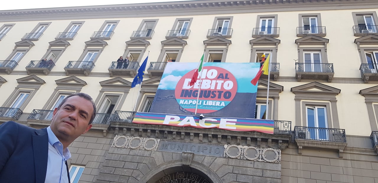 Quando arriviamo davanti Palazzo San Giacomo, sede del comune, il frontone già racconta di una situazione eccezionale. Campeggia infatti la scritta: “No al Debito Ingiusto. Napoli Libera“, con sotto l’arcobaleno della pace. A latere le bandiere del Comune e dell’Europa. Mi viene da pensare, chissà che effetto farebbe su Montecitorio, e se mai qualcuno potrà scriverlo. Intanto entriamo, dopo avere superato il filtro dei vigili urbani, rilassati ma attenti, e siccome siamo un filo in anticipo ci riceve e ci guida Mimmo Annunziata, capo dell’ufficio stampa.