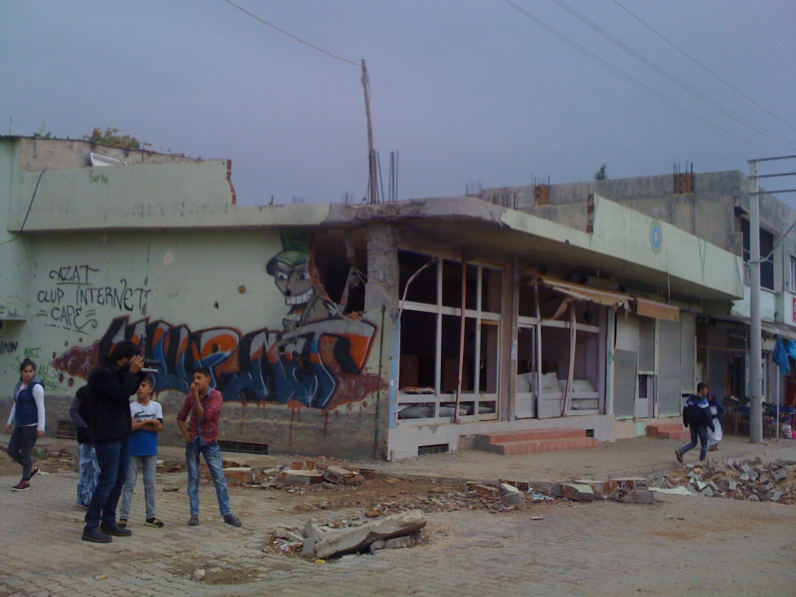 Ai primi di ottobre a Rifat c’è stata una dura battaglia tra esercito turco e Movimento Giovanile Patriottico e Rivoluzionario (YDG-H), l’ala giovanile del PKK. Sei giorni di scontri, i cui segni sono ancora molto evidenti. Ai quattro ingressi di Rifat una lunga serie di barricate in pietra. I ragazzini le hanno costruite con i mattoncini della pavimentazione stradale. Spesso tra una barricata e l’altra sono stati scavati dei fossati. Diversi edifici hanno i segni delle mitragliatrici e dei colpi di mortaio. Alcune case sono state distrutte, molti negozi sono bruciati. Durante la nostra visita i miliziani del YDG-H non si fanno vedere, ma controllano tutta la zona.