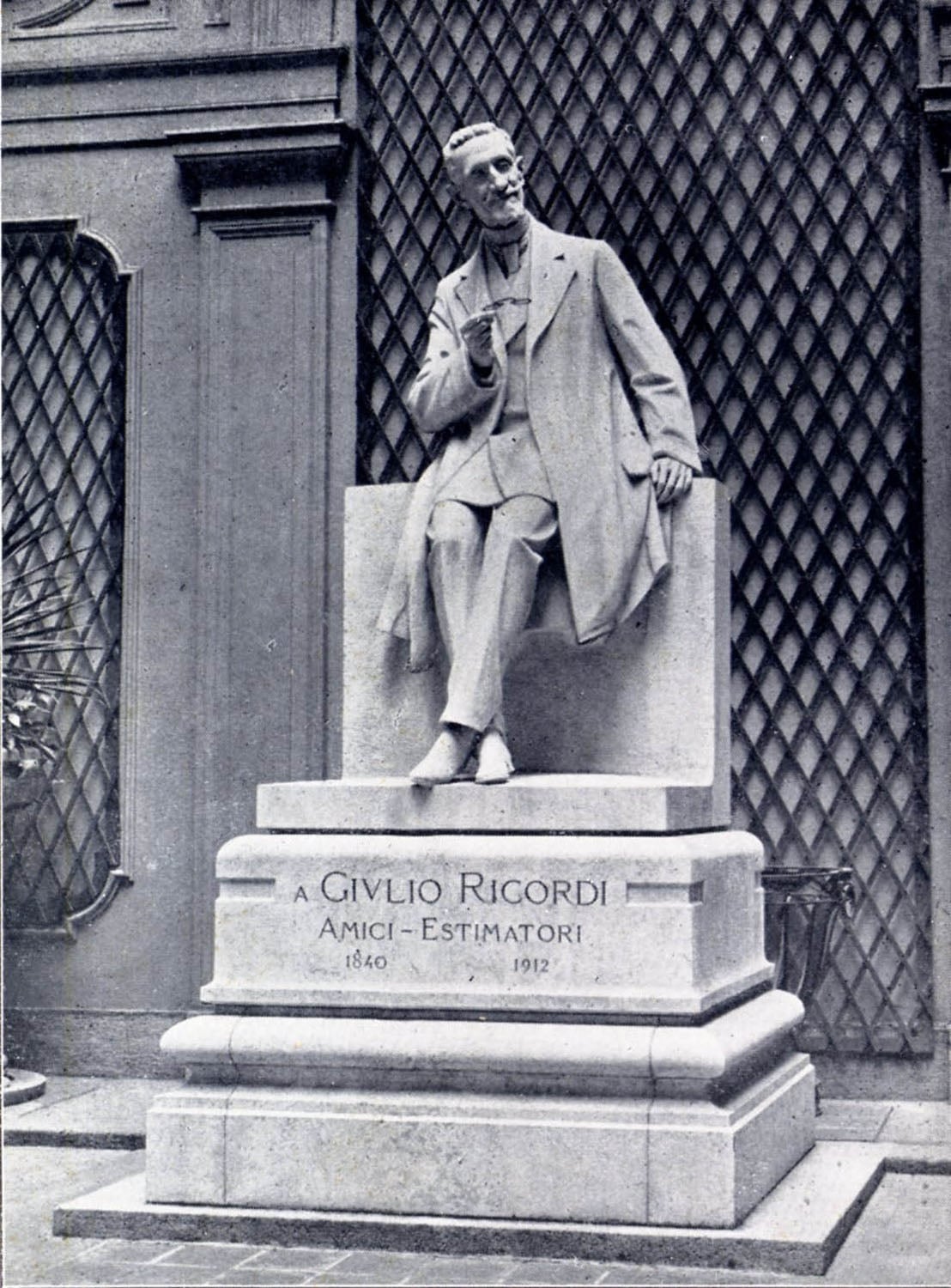 Pronipote di Giovanni, il fondatore di Casa Ricordi nel 1808, e figlio di Tito, l’editore musicale Giulio Ricordi fu uomo arguto e artista egli stesso, scrittore, giornalista, acquarellista e autore di variegate pagine musicali ben apprezzate anche da Giuseppe Verdi. Inflessibile sostenitore di un giovane Puccini, il sciur Giulio fu figura preminente e quasi rinascimentale “con la sua quieta e salda e garbata autorità… e la sua volontà svelta e acuminata come il taglio della sua ironia”. Queste sono alcune delle parole pubbliche, pronunciate nel decennale della sua scomparsa (1922) per scoprire la statua dello scultore Secchi in via Berchet, e che sarà deposta il 25 novembre in quella porzione di piazza della Scala chiamata Largo Ghiringhelli, luogo pubblico e confacente nonché sotto le finestre dello studio del Giulio e davanti alle vetrine del grande negozio Ricordi del 1844, oggi rispettivamente Museo del Teatro e ristorante “il Marchesino”.