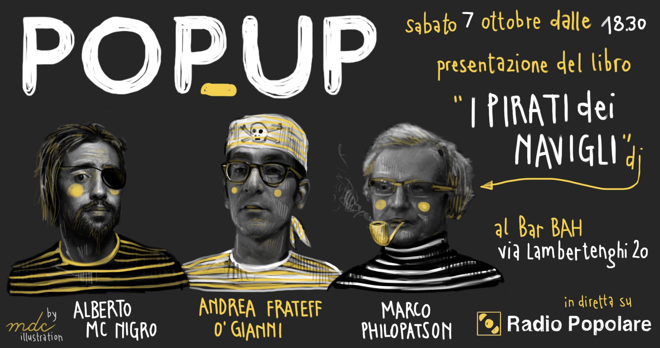 Sabato 7 ottobre PopUp torna in diretta dalle 18.30 al Bar Bah, in via Porro Lambertenghi 20 in zona Isola a Milano e ospita ai propri microfoni Marco Philopat appena uscito nelle librerie con la sua ultima fatica “I Pirati dei Navigli”.