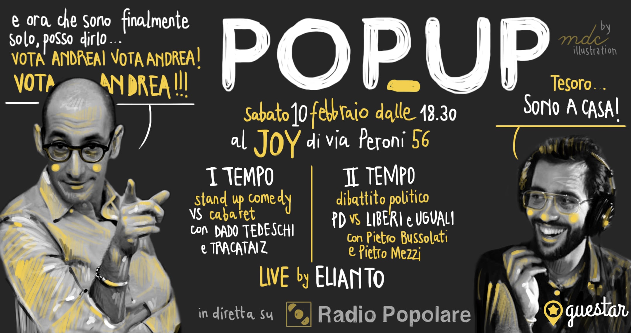 PopUp sabato 10 febbraio trasmette in diretta dalle 18.30 al Joy a Lambrate in via Valvassori Peroni 56, Milano.