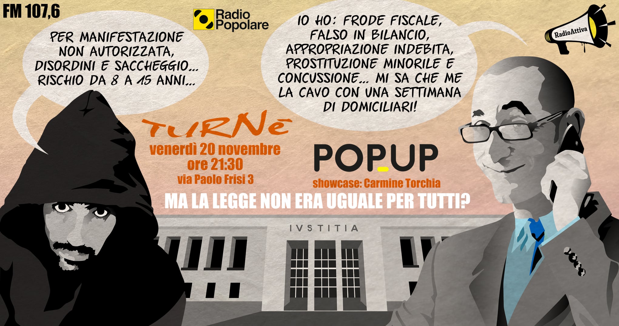 Questa settimana PopUp registra venerdì sera alle 21e30 dal Turné! È peggio spaccare una vetrina di una banca o farla fallire? Come mai chi ruba una mela va in galera e chi ruba un palazzo lo fanno re? Questo il tema della puntata in cui i nostri Dj Andrea Frateff-Gianni e Alberto Nigro cammineranno sul filo tra avvocati, professori, giornalisti e fotografi – ovviamente senza mai lasciar cadere il boccale!