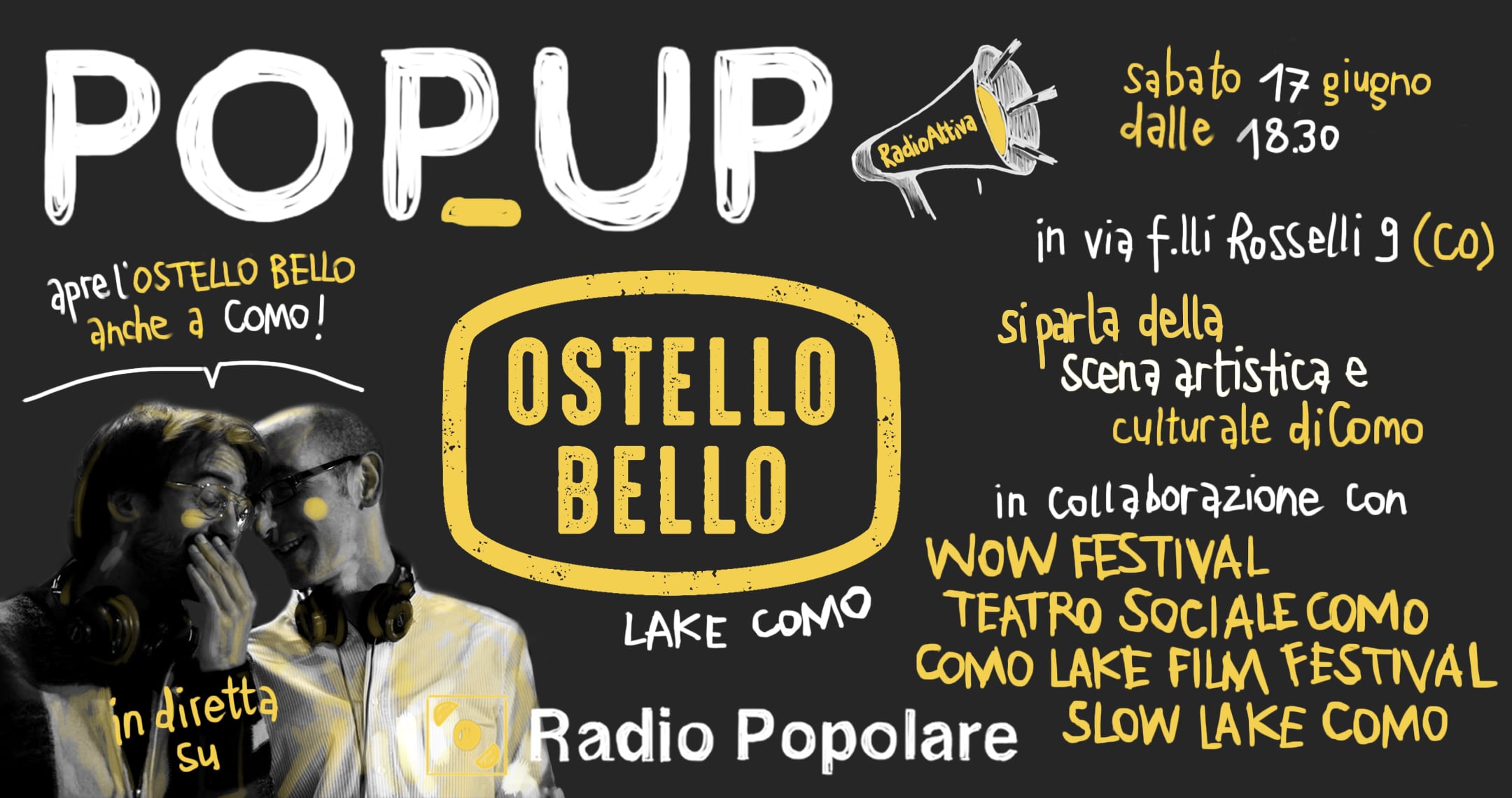 Sabato 17 giugno PopUp alle 18.30 torna in diretta e va in trasferta a Como nel nuovo Ostello Bello Lake Como in via Fratelli Rosselli 9.