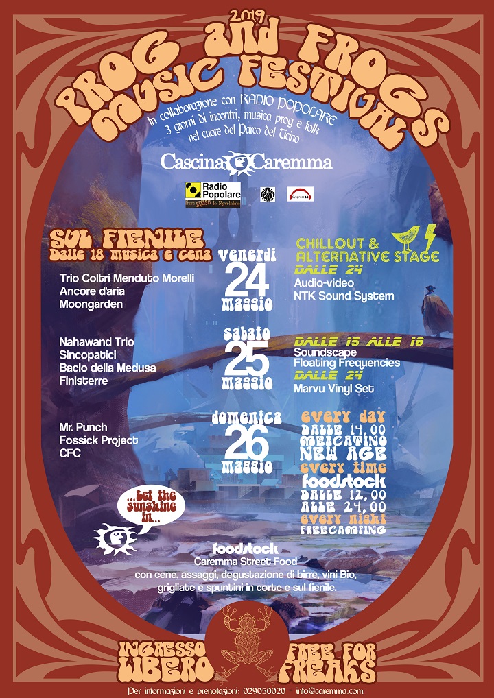 Prog And Frogs è un progetto corale nato dall’impegno di tre realtà differenti, unite per un obiettivo comune: l’imprenditoria sul territorio di Gabriele Corti (Cascina Caremma), la discografia indipendente e progressiva di Matthias Scheller (AMS Records), l’esperienza radiofonica di Renato Scuffietti (Radio Popolare). Gli artisti partecipanti sono stati selezionati dalla redazione di From Genesis To Revelation, ventennale programma dedicato alla cultura prog-rock sulle frequenze di Radio Popolare, mediapartner della manifestazione. Presentazioni, chiacchiere e opinioni sul mondo della musica con artisti, luminari e illuminati. Il programma è avvincente e diviso tra il Fienile di Cascina Caremma divenuto Main Stage e il Ticino Park Stage, dedicato alla musica elettronica notturna: si alterna così una proposta progressive, avant-rock, folk e psichedelica alla nottata chill-out.
