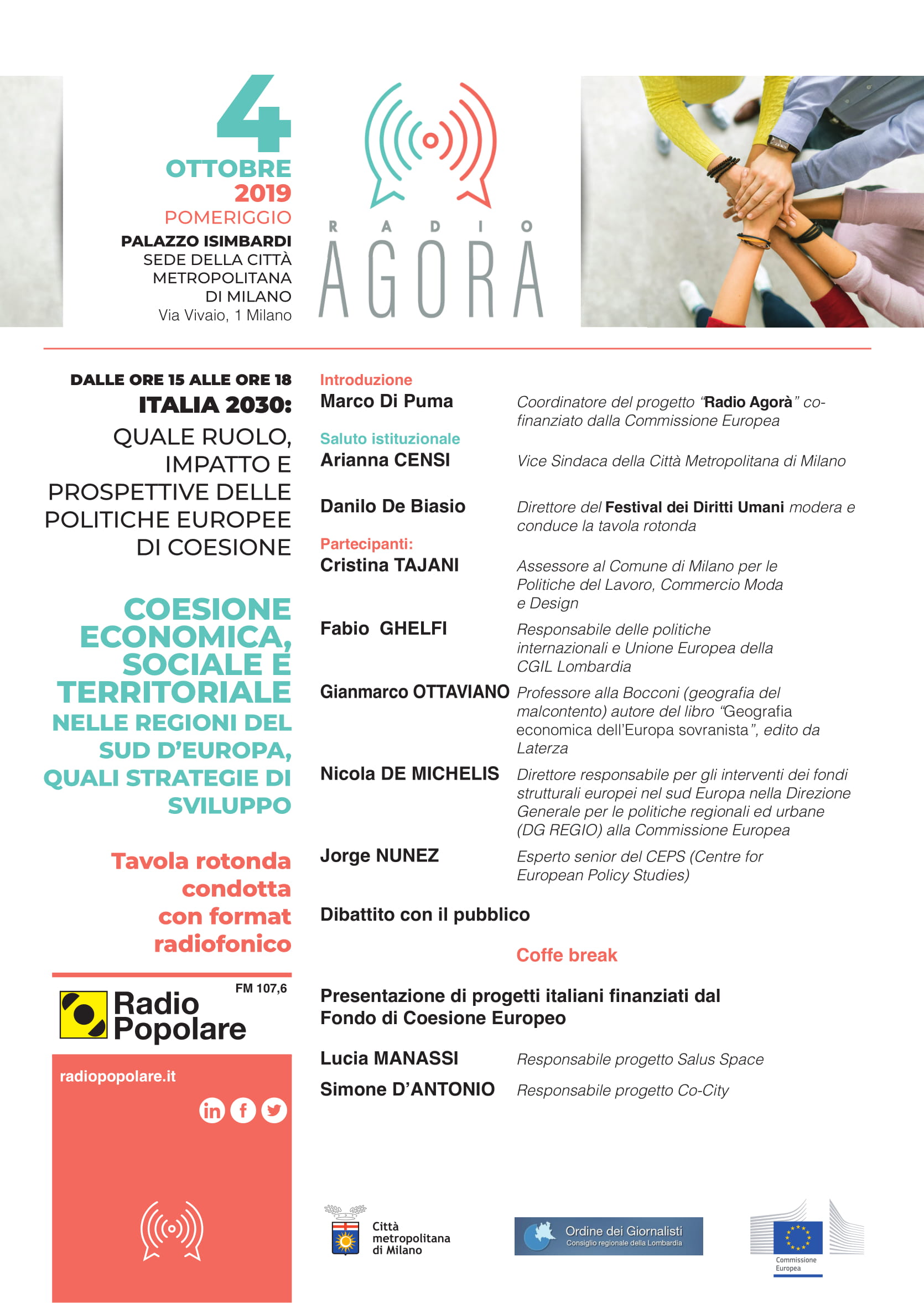 Segnate in agenda le date di venerdì 27 settembre e venerdì 4 ottobre: saranno le due giornate di incontri del progetto Radio Agorà, cofinanziato dalla Commissione Europea e ospitato a Palazzo Isimbardi, sede della Città metropolitana di Milano.