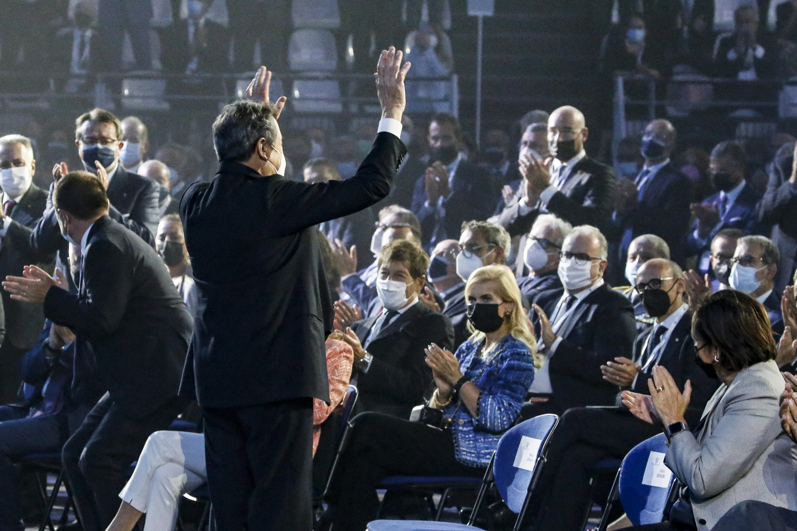 Foto | Il presidente del consiglio Mario Draghi dopo un lungo applauso durante l’Assemblea 2021 di Confindustria a Roma