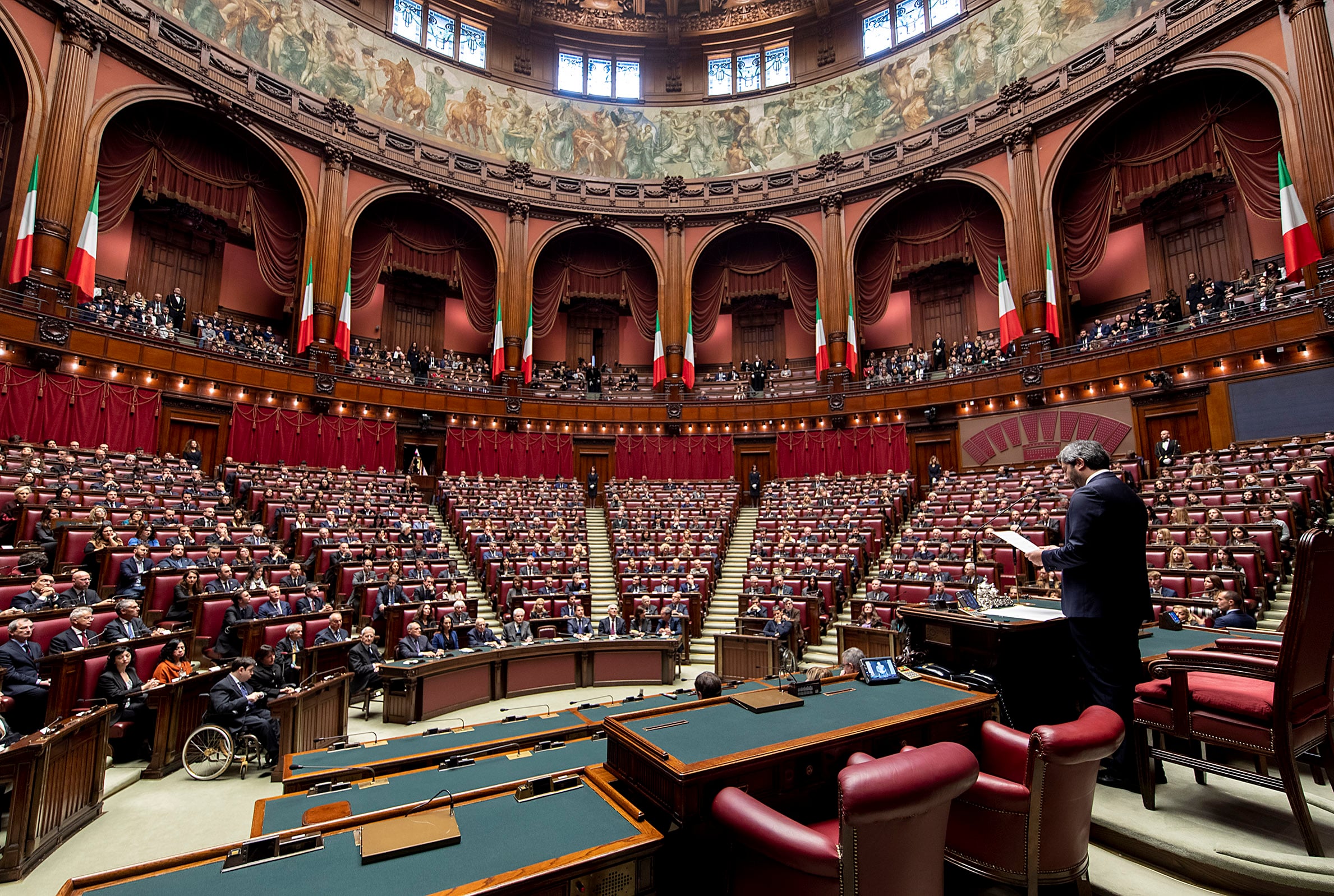 A guardare il Transatlantico nel primo voto per il Colle ai tempi del Covid si direbbe che è un po’ strano soprattutto per tutte le porte spalancate sul cortile e il freddo pungente che entra dentro costringendo a tenere i cappotti allacciati e la mascherina ben fissa sul volto, anche perché nonostante gli ingressi contingentati di 50 grandi elettori ogni volta, il grande salone antistante l’aula è strapieno di parlamentari, deputati, senatori, delegati regionali. I senatori a vita sono gli unici che se ne sono andati. Gli altri restano, e così il colpo d’occhio è quasi quello di sempre. Il pienone delle grandi occasioni. Dopodiché l’obbligo della mascherina rende tutto surreale, i nomi dei candidati già sono sussurrati, il risultato è che fanno fatica anche a parlarsi e a capirsi tra loro. Ma è qui che si viene a sapere tutto e quindi i divani, malgrado gli adesivi con i divieti di sedersi, sono occupati dai politici, mani che si stringono, processione verso la buvette per il caffé con la fila per esibire il green pass, lunghe file a volte che servono ai cosiddetti peones a capire che sta succedendo. Gli incontri si susseguono da stamattina presto, il più attivo di tutti è Salvini che è stato visto passare come una scheggia in Transatlantico e poi eclissarsi nelle sue stanze. Matteo Salvini ha visto tutti in poche ore, Meloni, Letta, Conte, compreso Mario Draghi, e la notizia è subito rimbalzata qui in Parlamento, ma dal governo nessuna conferma e nemmeno smentiscono l’intenzione di vedere anche tutti gli altri. Ma a parte i leader, a fare le trattative servono anche i capannelli, quello dei Cinque stelle, con Di Maio sempre sorridente e seguito da una scia dì suoi colleghi. Fuori dal portone i parlamentari entrano a gruppi, oggi si va veloci perché nessuno scrive nulla, scheda bianca. Se si gira l’angolo si può incontrare anche un’ambulanza, trasporta i positivi al Covid che devono votare, senza mai scendere dal veicolo. Voleva votare anche la no vax Cunial, non ha potuto farlo e ora minaccia, “farò invalidare il voto per il presidente della Repubblica”.