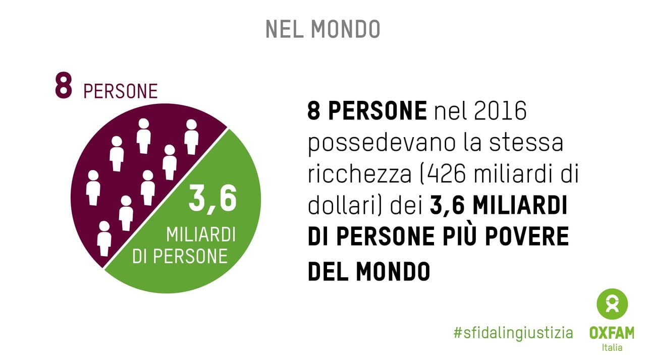 “È osceno che così tanta ricchezza sia nelle mani di una manciata di uomini, che gli squilibri nella distribuzione dei redditi siano tanto pronunciati in un mondo in cui 1 persona su 10 sopravvive con meno di 2 dollari al giorno”, ha detto Roberto Barbieri, direttore generale di Oxfam Italia. “La disuguaglianza stritola centinaia di milioni di persone, condannandole alla povertà; rende le nostre società insicure e instabili, compromette la democrazia”.