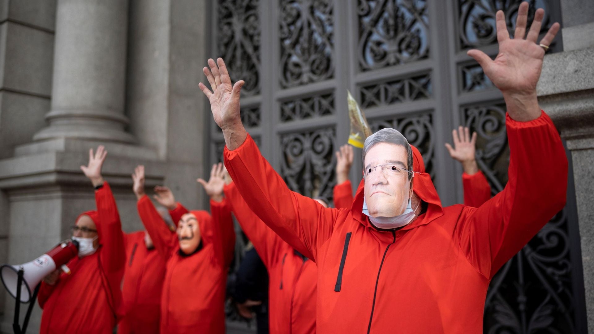 FOTO| Un manifestante indossa una maschera del Ministro dell’Inclusione, della Sicurezza Sociale e delle Migrazioni, Jose Luis Escriva, durante una protesta a Madrid, in difesa del sistema pensionistico pubblico in Spagna.