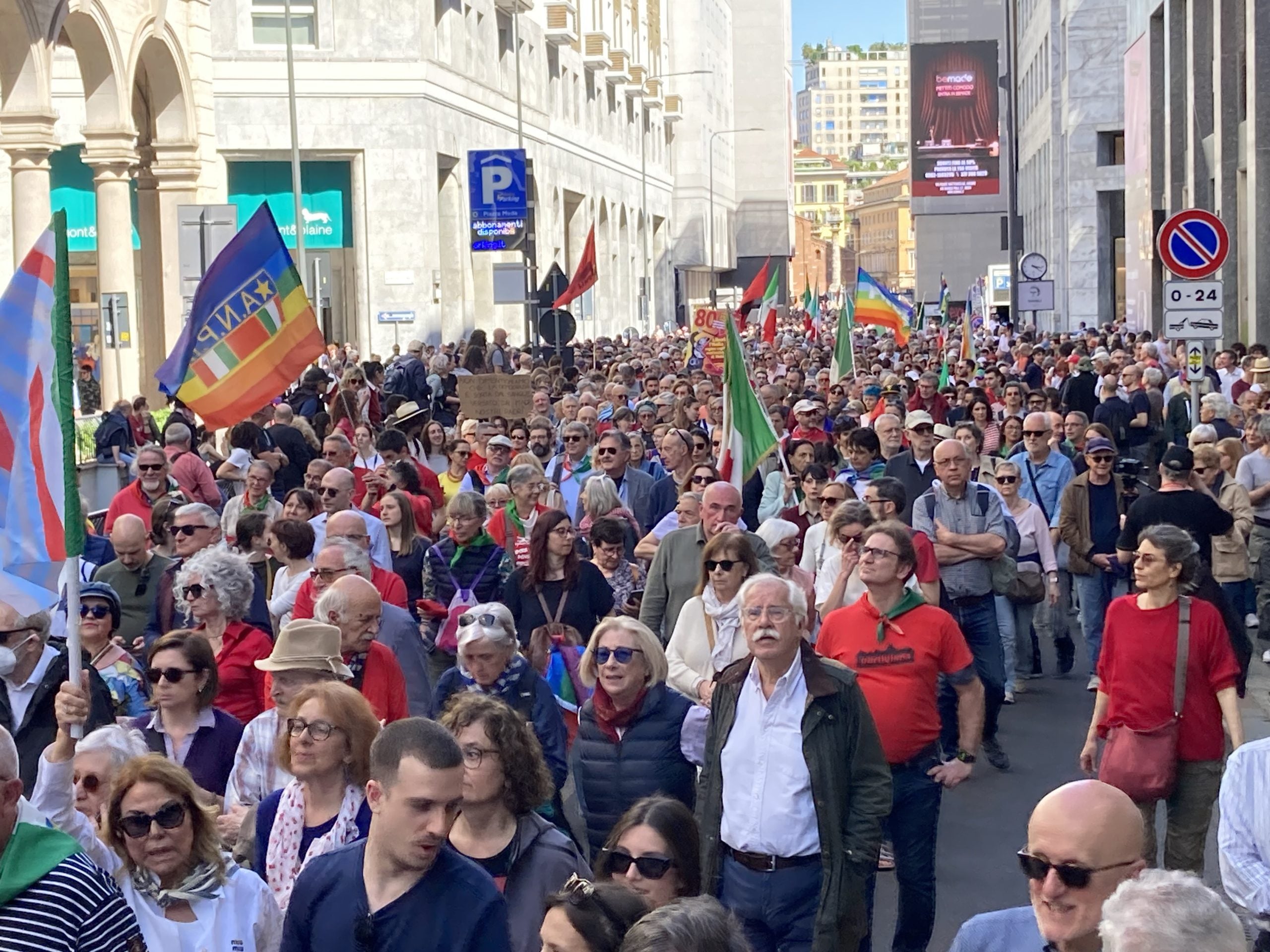 La mitica banda d’Affori, citata in una celebre canzone che mandava la radio nei mesi della Resistenza, ha aperto il corteo e suonato senza sosta. Il Tamburo Principal, Bella Ciao, Valsesia. Sarà stata la risposta alla richiesta di sobrietà, altrove la banda è stata vietata. Decine di migliaia di persone hanno sfilato in un clima gioioso, nonostante tutto. Nonostante ogni giorno arrivino nelle nostre vite notizie di guerre, di massacri, e di una continua compressione dei diritti che le Destre di mezzo mondo stanno mettendo in atto. Si sentiva tra la gente un’ energia, una consapevolezza, una gran voglia di proteggere il 25 aprile. ‘Sta cambiando l’aria, è importante partecipare’ ci ha detto una manifestante, e mai sintesi fu più efficace. Il sindaco di Milano Beppe Sala al microfono di Radio Popolare ha fatto appello ai cittadini e alle cittadine perche siano ‘antifascisti praticanti’. Significa esserci, stare tutti i giorni nelle battaglie giuste.