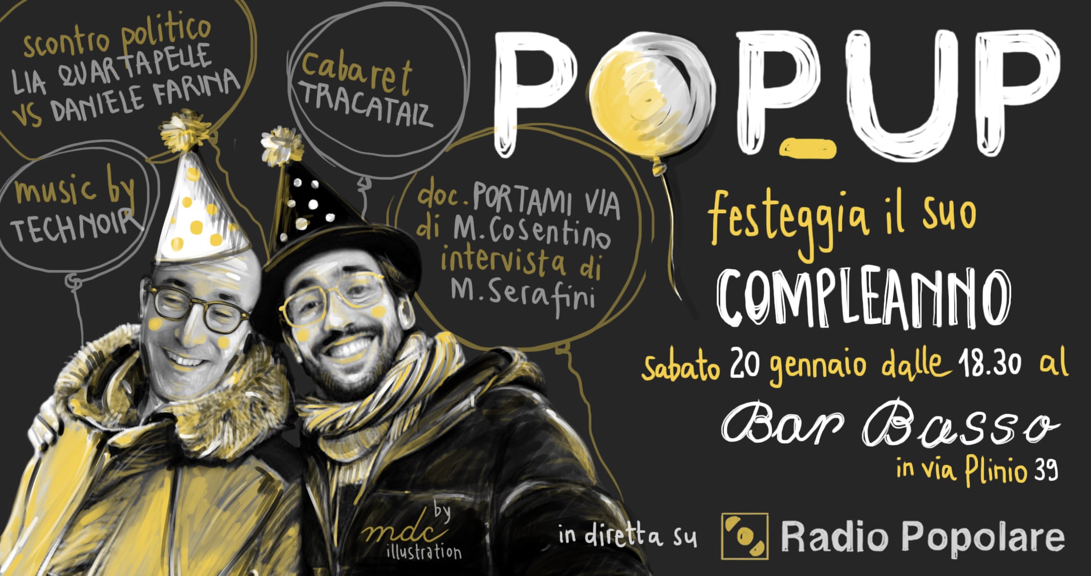 PopUp, il programma itinerante di Radio Popolare, questo sabato, 20 gennaio, festeggia in diretta dalle 18.30 il suo terzo compleanno in Fm dal luogo da dove tutto è cominciato. Grande festa al Bar Basso di via Plinio 39 a Milano.