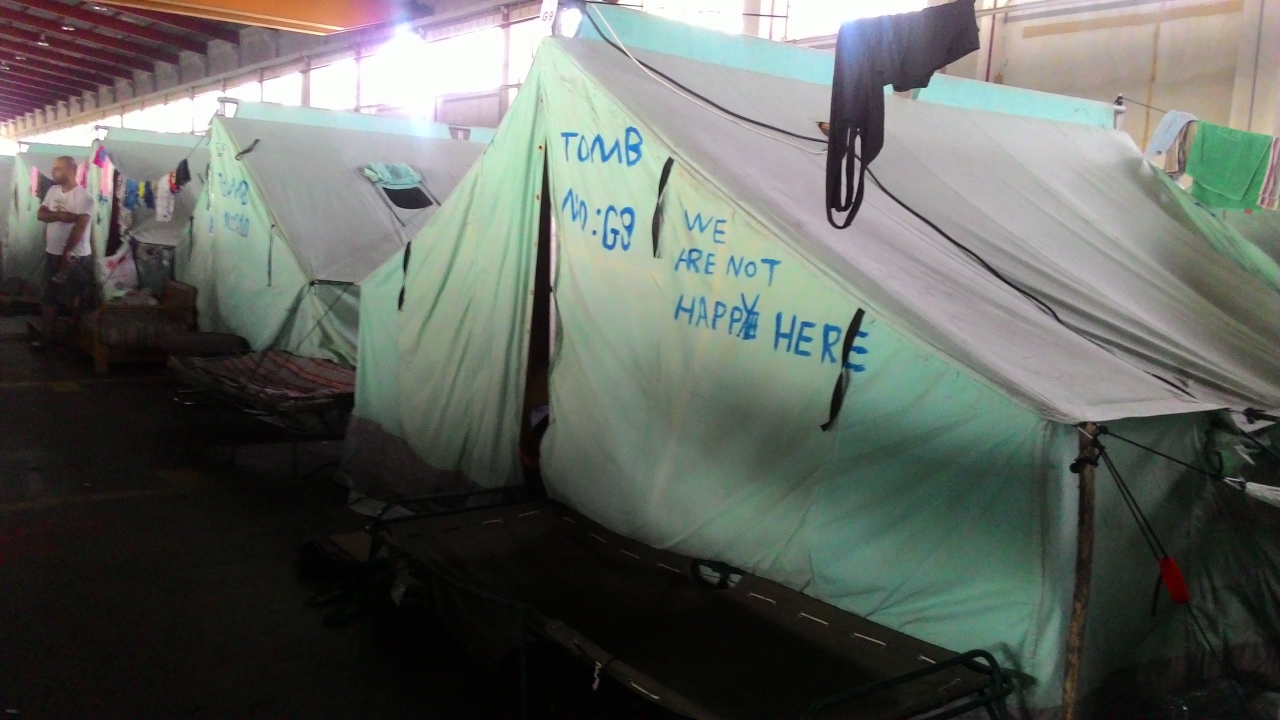 Tendopoli all’interno di fabbriche abbandonate nelle periferie industriali delle città, con pochi e inadeguati servizi igienici, senza acqua calda, costretti a vivere senza privacy su stuoini e coperte grigie militari in otto o più persone per tenda. Le giornate sono scandite dal ritmo monotono della distribuzione dei pasti, cibo insapore – se non cattivo – cucinato per migliaia di persone e consegnato in vaschette di plastica. Cibo che viene buttato dai profughi, che si lamentano e che vorrebbero poter cucinare per sé stessi, ma che non possono farlo per motivi di sicurezza. In realtà nei campi ciò che è probito avviene comunque. Le persone più intraprendenti si muovono e vanno nei paesi e cittadine attorno ai campi per comprare cibo e suppellettili per rivenderle nei campi, dove dunque si trovano coltelli, fornelli a gas, pentole.