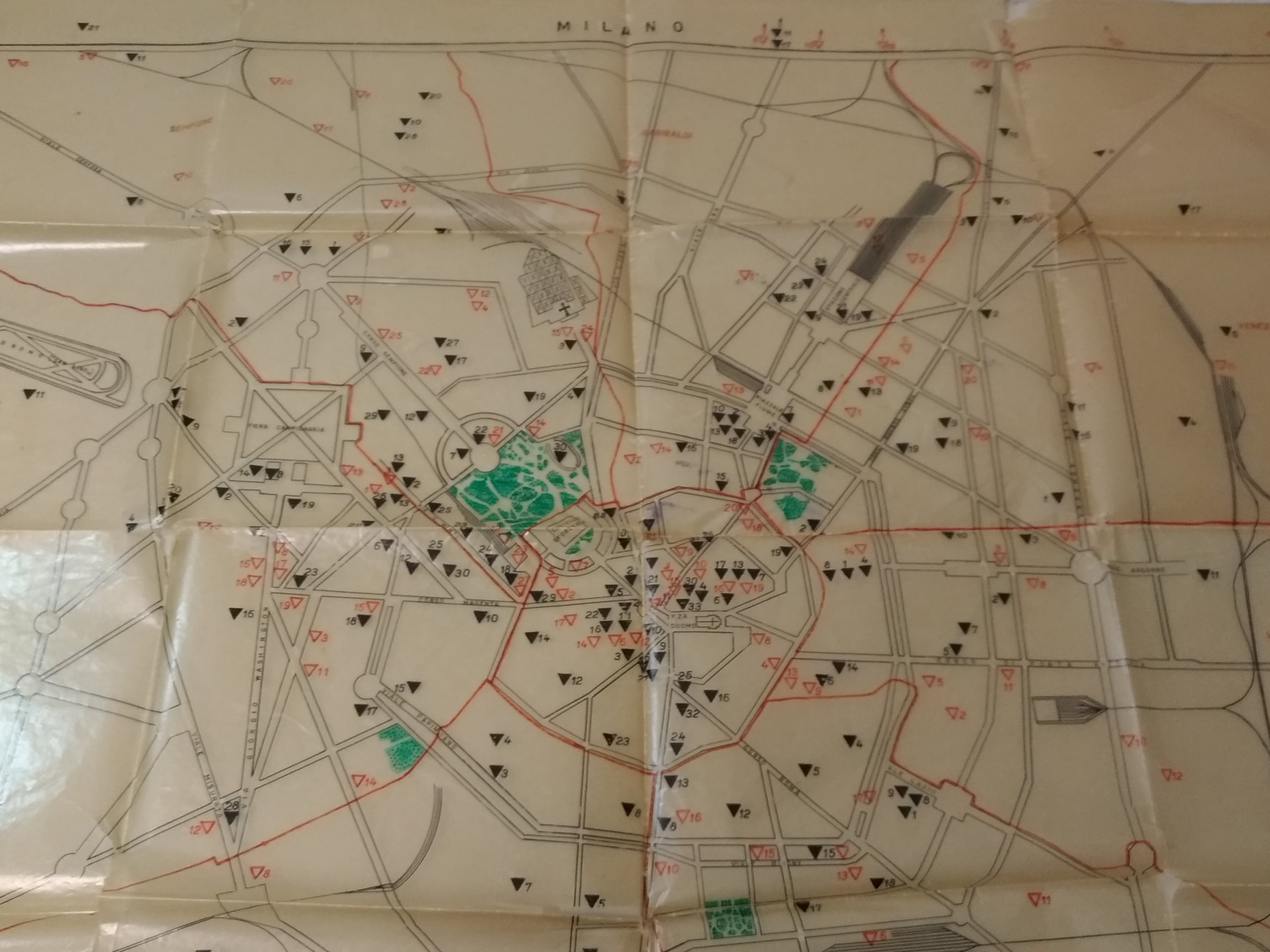 E’ la mappa realizzata dal Comando di piazza di Milano del Corpo Volontari della Libertà in vista della presa della città da parte dei Partigiani, il 25 Aprile del 1945. La mappa è conservata nell’archivio dell’Istituto Nazionale Ferruccio Parri, a Milano.